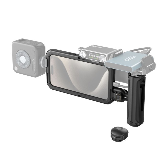El kit SmallRig Mobile Video Kit (Single Handheld) para iPhone 15 Pro 4398 incluye una empuñadura de control inalámbrica que permite grabar «con un solo clic» y garantiza una grabación de vídeo y vlogs estables. La jaula cuenta con varios orificios con rosca de 1/4"-20 y una placa de montaje para fijar el mango, el trípode, el micrófono, la luz LED de vídeo,…