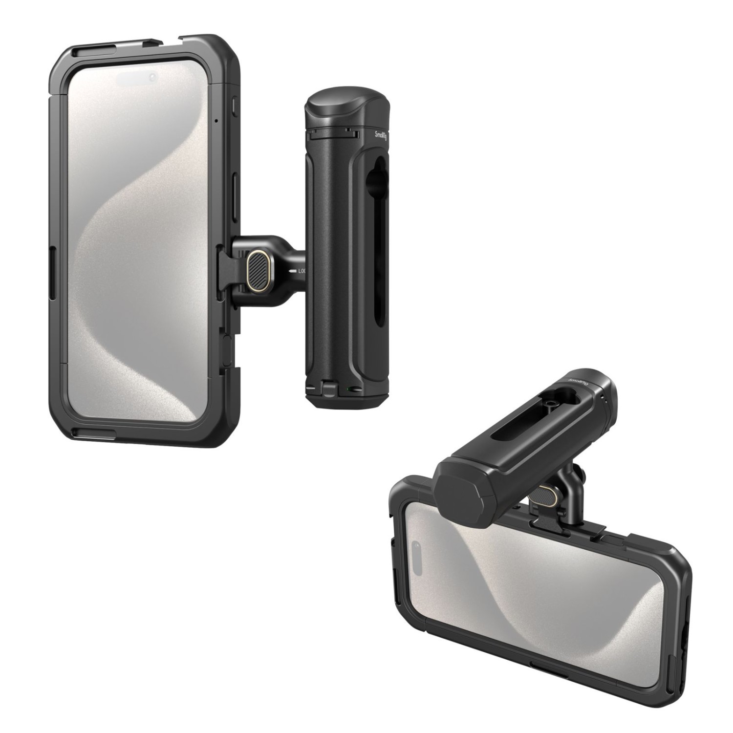 El kit SmallRig Mobile Video Kit (Single Handheld) para iPhone 15 Pro 4398 incluye una empuñadura de control inalámbrica que permite grabar «con un solo clic» y garantiza una grabación de vídeo y vlogs estables. La jaula cuenta con varios orificios con rosca de 1/4"-20 y una placa de montaje para fijar el mango, el trípode, el micrófono, la luz LED de vídeo, etc. Todos ellos están equipados con el nuevo diseño de fijación rápida de SmallRig para cambiar de forma fácil e inmediata entre la grabación en orientación horizontal y vertical. La jaula maciza totalmente metálica también es compatible con objetivos como los de montura M o, tras cambiar la placa trasera, los objetivos con rosca de 17 mm / 37 mm, los objetivos de la serie T de Moment. Está discretamente recortada para permitir un acceso completo a los botones, puertos, radar y objetivo ultra gran angular del iPhone, así como al cargador inalámbrico MagSafe, mientras que las almohadillas integradas evitan posibles golpes y arañazos.