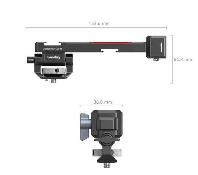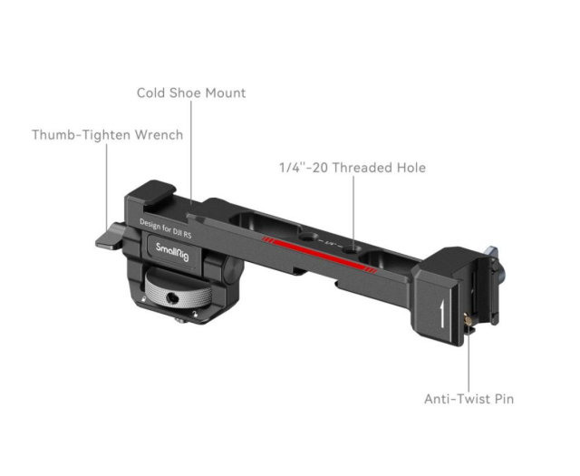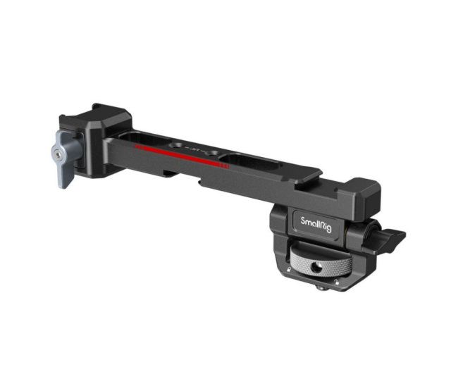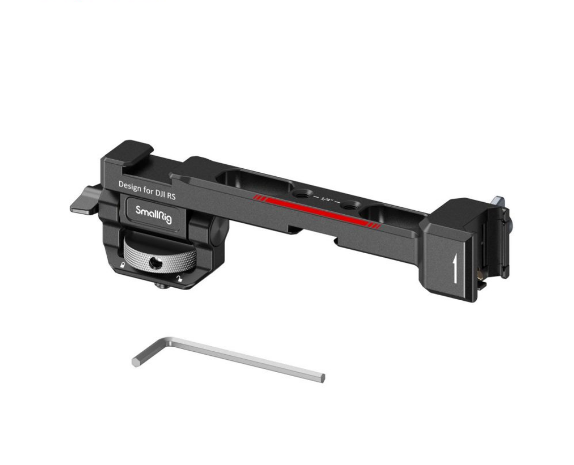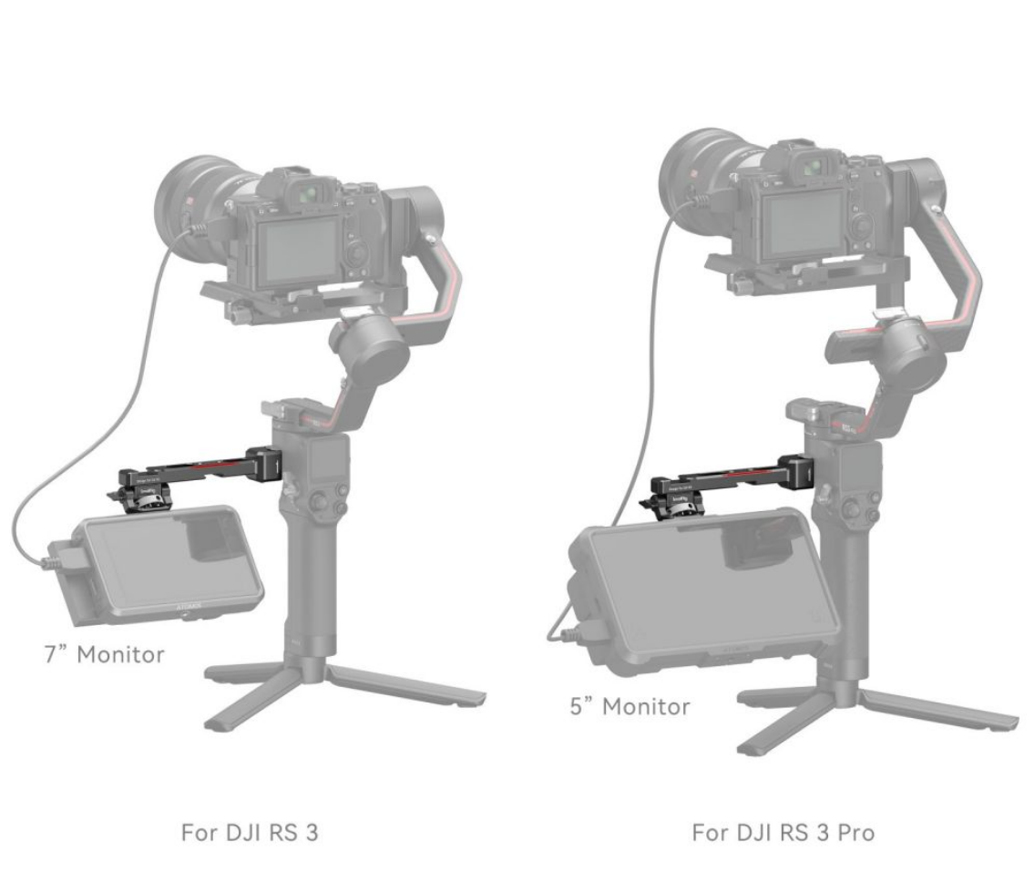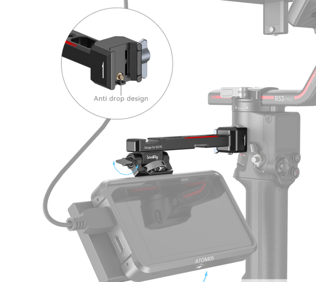 Soporte para monitor SmallRig para DJI RS 2 / RSC 2 / RS 3 / RS 3 Pro / RS 3 Mini 3026B está diseñado para los gimbals DJI RS 2 / RSC 2 / RS 3 / RS 3 Pro / RS 3 Mini con el fin de montar accesorios adicionales, como un monitor, una luz LED de vídeo, un receptor de audio, un transmisor de vídeo, una cámara de acción, etc. Se fija rápidamente a ambos lados del gimbal mediante una abrazadera NATO, que cuenta con un diseño antideslizamiento para mayor seguridad, y un botón para el pulgar que permite inclinar el monitor hasta 170°. Hay varios puntos de fijación para accesorios, incluyendo dos orificios de 1/4''-20 en la parte superior para el brazo Magic Arm 3238 para una cámara de acción o un transmisor de vídeo, y un soporte cold shoe en la parte superior e inferior para un receptor de audio, un micrófono, una luz LED de vídeo, etc. Otra característica interesante es el pasador antirrotación, que ayuda a estabilizar aún más el monitor. En general, el 3026B, compatible con monitores de 5" y 7", es compacto y encaja a la perfección con los estabilizadores cardán de la serie RS de DJI en cuanto a estilo de diseño y fijación de accesorios.
