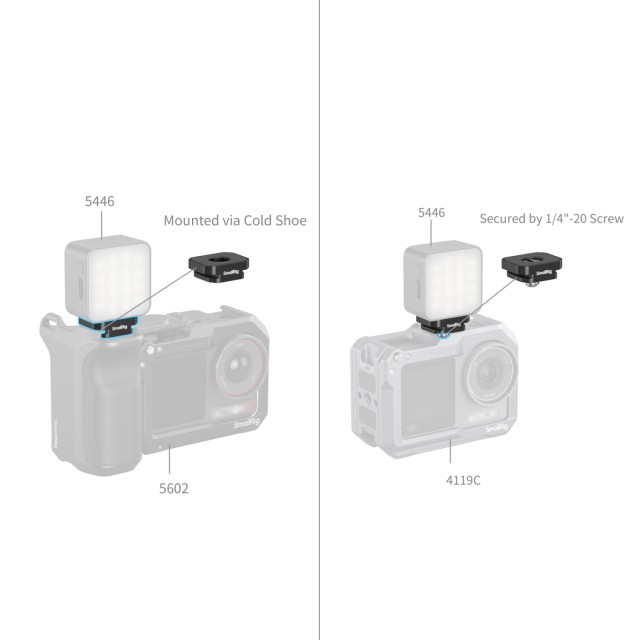 Los soportes admiten dos métodos de fijación: fijación en zapata fría y fijación mediante rosca. Esta flexibilidad garantiza la compatibilidad con la jaula SmallRig (ID 4119C) y las luces de vídeo magnéticas (ID 5446), así como una integración fluida con el DJI Mic 2.