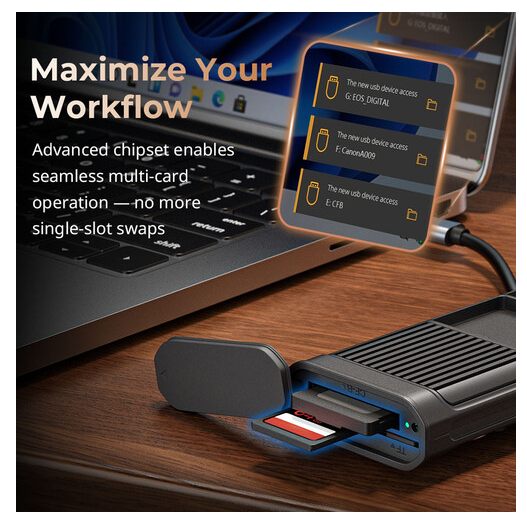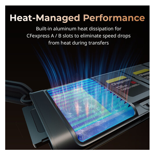 • Transferencia simultánea de alta velocidad desde CFexpress Type B, SD y microSD (hasta 1250 MB/s)