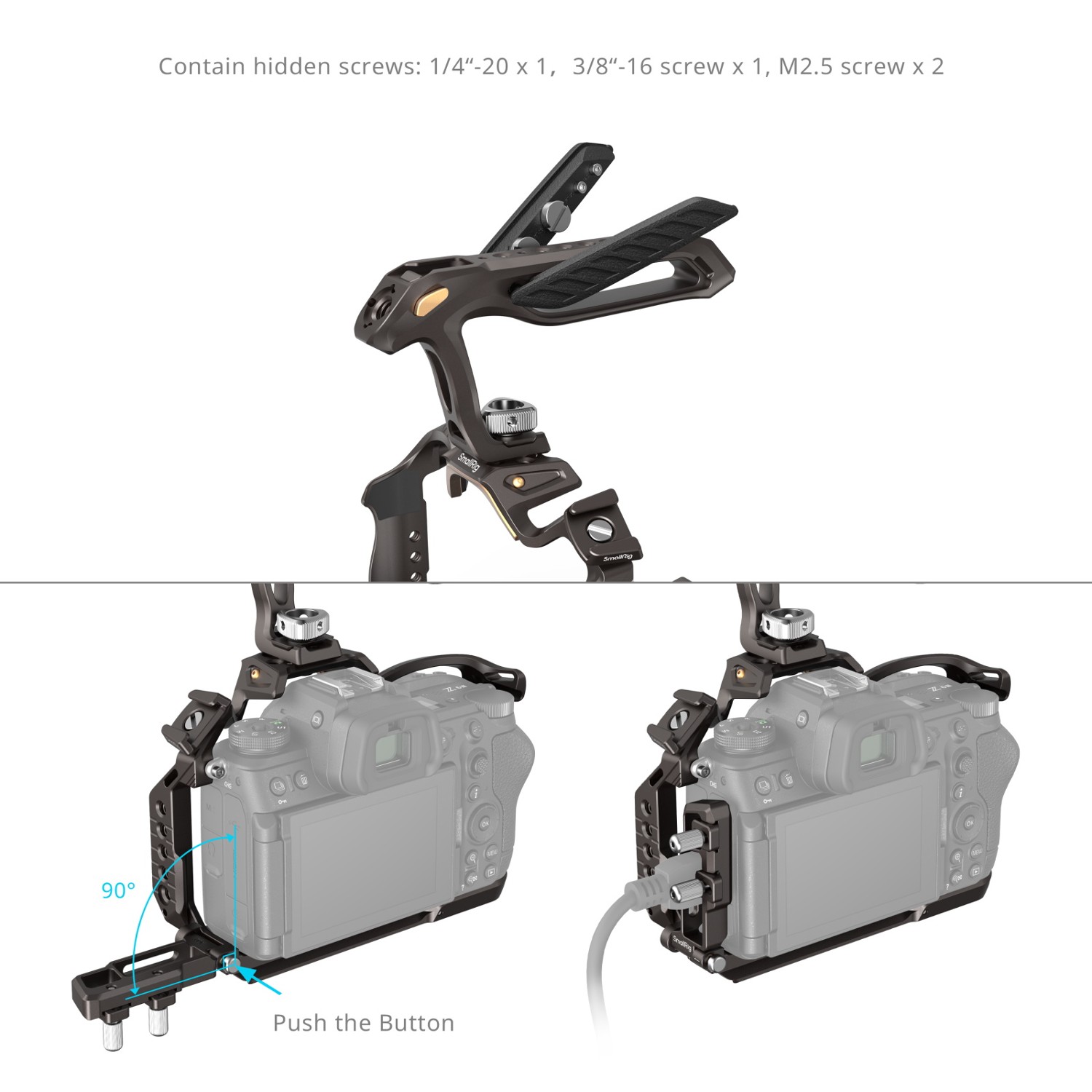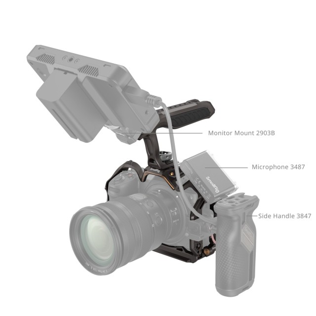El kit de jaula SmallRig «Night Eagle» para Nikon Z 6III 4522 está diseñado para ofrecer una mejor captura desde ángulos bajos, una carcasa protectora y opciones versátiles de ampliación de la cámara. La jaula destaca por su diseño moderno con elegantes curvas, sutiles detalles dorados y un nuevo acabado en color marrón bronce. El kit incluye la jaula, una empuñadura superior, una abrazadera para cables HDMI y USB-C, y un soporte para zapata fría. La abrazadera para cables utiliza un diseño «press-and-flip» que permite un fácil acceso a las interfaces sin necesidad de desmontarla y evita la interrupción accidental de la señal, lo que garantiza una transmisión estable. El soporte desmontable para zapata fría está equipado en la parte inferior con pasadores de posicionamiento para evitar el desplazamiento.