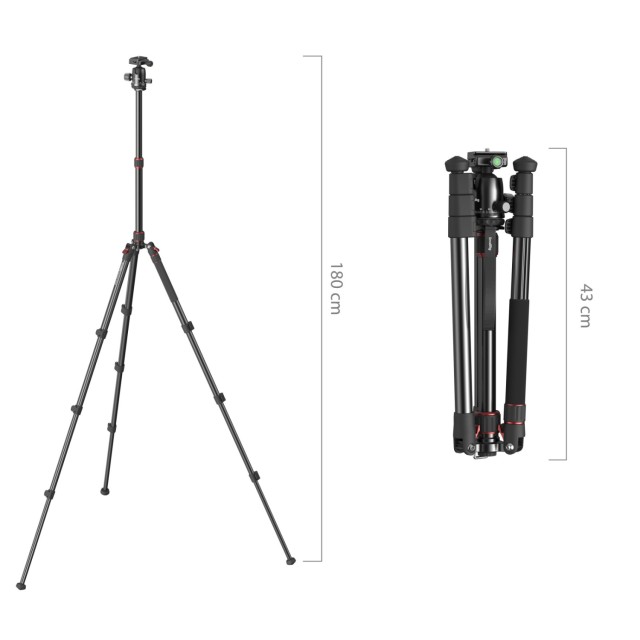 Con una altura máxima de trabajo de 180 cm / 71 pulgadas, este trípode permite diversos ángulos de toma y, al mismo tiempo, se puede plegar hasta una longitud compacta de 43 cm / 16,9 pulgadas. Pesa solo 1,56 kg / 3,4 libras, es ligero y fácil de transportar. La rótula metálica con giro de 360° garantiza una estabilidad robusta y las patas de aleación de aluminio soportan una carga de hasta 15 kg (5 kg en la rótula).