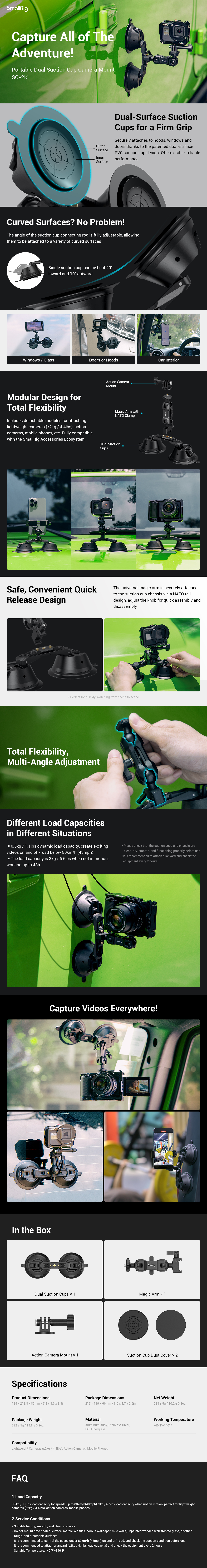El soporte portátil para cámara con doble ventosa SmallRig SC-2K 3566 ofrece una solución ligera para grabar con una cámara de acción o un teléfono móvil desde el coche. Su diseño modular, que incluye dos ventosas, un brazo mágico universal y un soporte para cámaras de acción, es compatible con la mayoría de las cámaras ligeras (por ejemplo, la Sony ZV-1, la serie G7X de Canon, etc.), cámaras de acción y teléfonos móviles del mercado. El soporte para cámara con dos ventosas está diseñado para desmontarse rápidamente con solo pulsar un botón; Además, el exclusivo diseño patentado de doble capa de las ventosas permite una grabación segura, duradera y estable; en el punto donde las ventosas se unen entre sí, el espacio es ajustable en un ángulo de 20°, lo que permite su fijación en superficies curvas. El brazo mágico universal se fija en un extremo a las dos ventosas mediante un riel NATO y se monta rápidamente en otros accesorios para riel NATO, mientras que el tornillo de 1/4"-20 del otro extremo sirve para conectar cámaras, teléfonos móviles, cámaras de acción y otros dispositivos. El accesorio para cámaras de acción incluye un soporte universal GoPro y un tornillo de fijación que sujeta el brazo mágico para cámaras de acción. Además, el paquete incluye una cubierta especial antipolvo con ventosa que evita la acumulación de polvo, prolongando así su vida útil.