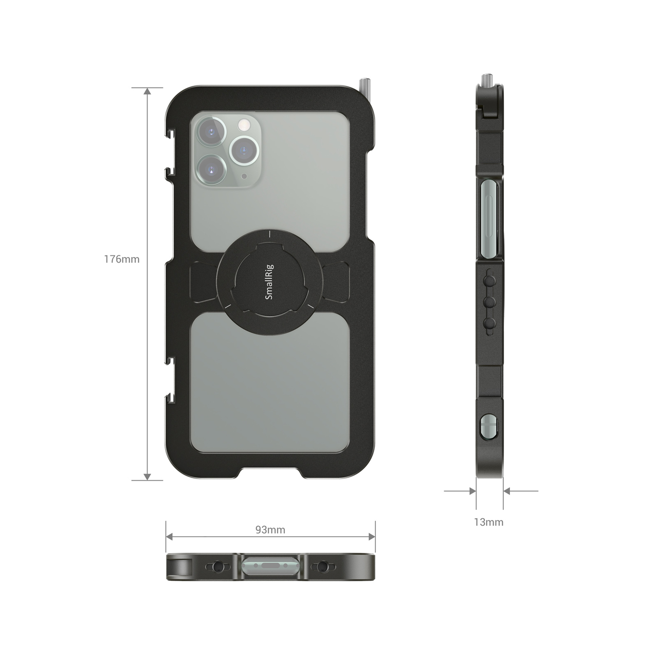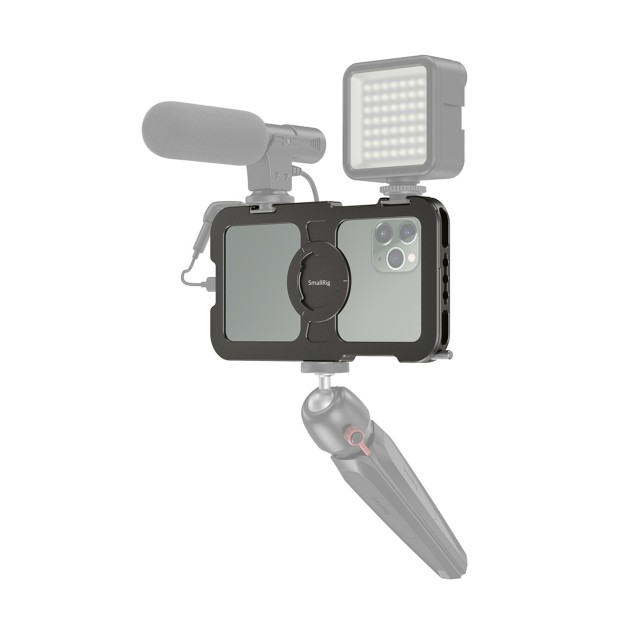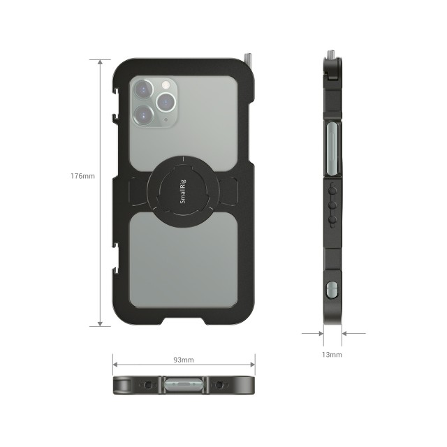 La jaula SmallRig Pro Mobile Cage para iPhone 11 Pro Max CPA2512 está diseñada para proteger tu iPhone 11 Pro Max y permitir la conexión de accesorios adicionales para la fotografía y la grabación de vídeo con el móvil, retransmisiones en directo, entrevistas, vlogs, etc. En un lado cuenta con un tornillo que garantiza un montaje y desmontaje rápido del teléfono. Está equipada con dos patas y varios orificios roscados de 1/4"-20 para montar diversos accesorios, como micrófonos, luces LED, trípodes, etc., y admite la captura tanto horizontal como vertical. Es compatible con la empuñadura lateral de aluminio SmallRig para la jaula de smartphone HSS2424, para grabar a mano alzada, y con la abrazadera para cables SmallRig para la jaula de teléfono móvil BSC2390, para sujetar el cable durante la grabación. Las almohadillas de goma integradas ayudan a amortiguar los golpes y evitan que el teléfono se raye. El diseño hueco, pensado para reducir el peso y facilitar la refrigeración del teléfono móvil, evita los botones laterales y las interfaces, así como la zona de la antena, para evitar el riesgo de interferencias en la señal. También cuenta con un orificio para pasar una correa de muñeca.