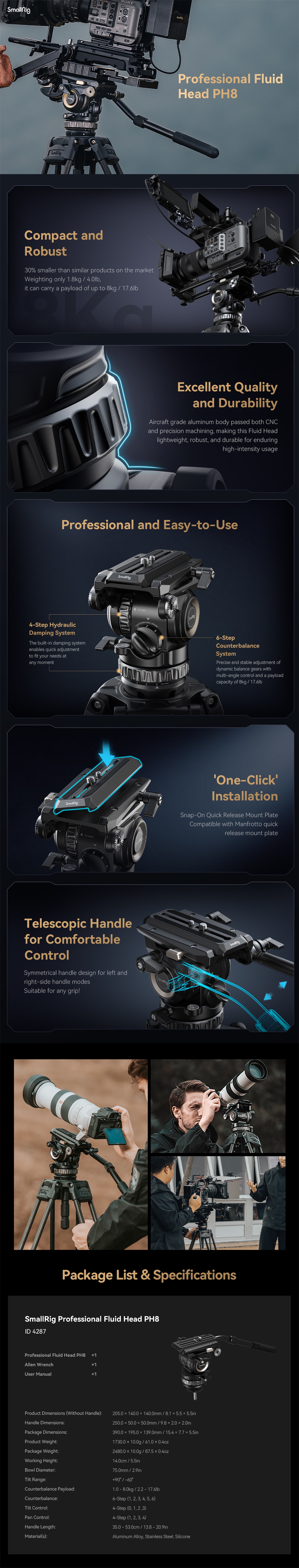 El cabezal fluido profesional SmallRig PH8 4287 es un cabezal fluido profesional que facilita la grabación de vídeo. El cabezal fluido está equipado con un sistema de contrapeso ajustable de seis posiciones. Con una altura del centro de gravedad de 55 mm / 2,2", el sistema de contrapeso de seis posiciones equilibra la cámara u otras plataformas (hasta 8 kg / 17,6 lb) y controla con precisión la inclinación de la cámara. El sistema de amortiguación hidráulico ajustable de 4 pasos permite ajustar el giro y la inclinación, y garantiza un movimiento fluido de la cámara. El cabezal fluido PH8 utiliza un nuevo diseño de placa de fijación rápida Touch-and-Go que no requiere ajuste y es más eficaz que las placas deslizantes tradicionales. El mango telescópico extraíble y fácil de usar permite girar el soporte tanto hacia la izquierda como hacia la derecha, por lo que se adapta a cualquier tipo de agarre. El cabezal fluido profesional PH8 es ligero, compacto y robusto. Pesa solo 1,8 kg / 3,9 lb, por lo que es más pequeño que otros productos similares del mercado.
