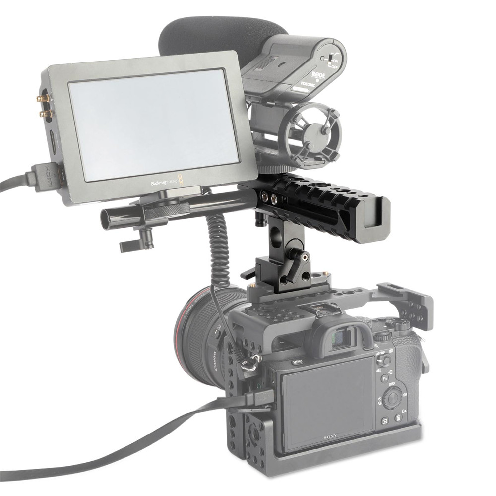 Soporte integrado para zapata en la parte superior para fijar luces a la cámara, soportes antivibración para micrófonos, etc. Otro soporte integrado para zapata en el extremo del mango para fijar un soporte EVF, etc. El mango se suministra con un patrón de orificios para pasadores para fijar accesorios ARRI. Orificios de 1/4''-20 y 3/8''-16 en la empuñadura para fijar otros accesorios. Además, el acabado con ranuras profundas y una serie de puntos de montaje te ofrece un agarre cómodo. La empuñadura es ideal para grabar en modo bajo y transportar fácilmente la cámara.