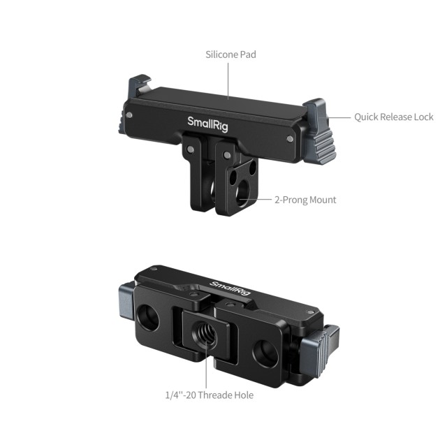 La base está equipada con un soporte abatible de 2 puntos y una rosca de 1/4"-20, lo que garantiza una amplia compatibilidad con los accesorios de SmallRig, como los soportes con ventosa (ID 4235), pinza de cangrejo (ID 4102B), barras selfie (ID 5403) y soportes para el cuello (ID 5126).