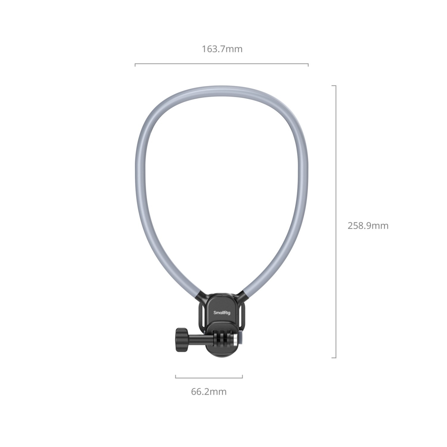 El collarín, con una longitud total de 600 mm (23,6 pulgadas), cuenta con un diseño simplificado para un uso cómodo. Además, incluye un soporte universal de dos pines que garantiza la compatibilidad con las cámaras de acción GoPro y otros modelos habituales equipados con un adaptador de dos pines.
