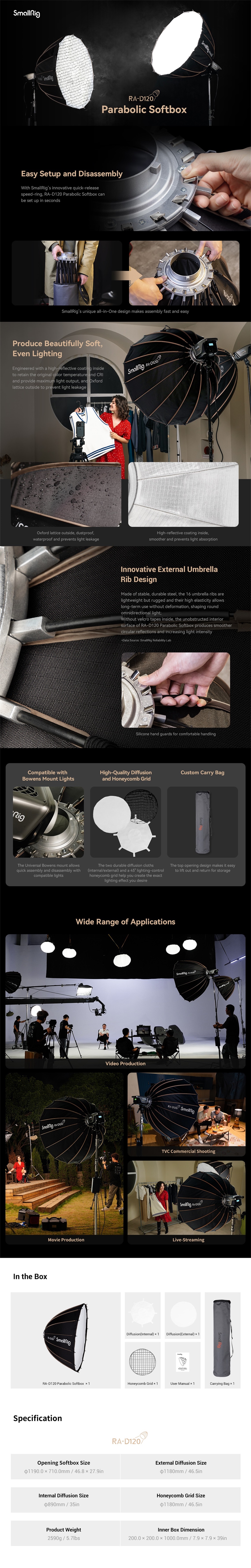 El SmallRig RA-D120 Parabolic Softbox es un difusor universal con un diámetro de 120 cm. El soporte universal Bowens es compatible con las luces SmallRig RC 120D/RC 120B/RC 220D/RC 220B/RC 350D/RC 350B/RC 450D/RC 450B con fuente de luz puntual y otras luces con soporte Bowens disponibles en el mercado. La nueva generación de diseño de fijación rápida, desarrollada de forma independiente, permite una fácil instalación y desmontaje en 15 segundos para una mayor comodidad del usuario. Se suministra de serie con una rejilla de panal de 45° para aumentar la direccionalidad en diferentes escenarios. Utiliza un material blando de calidad industrial y un acabado altamente reflectante; dos difusores garantizan un suavizado eficaz de la luz o una mayor transmisión de la luz para satisfacer diferentes requisitos.