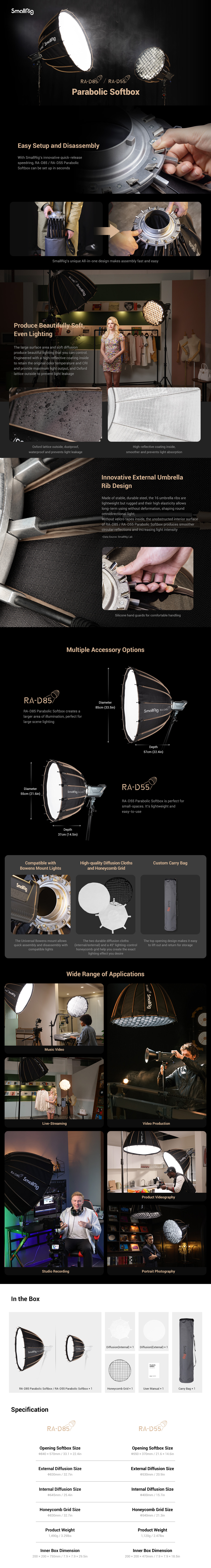 El SmallRig RA-D85 Parabolic Softbox 3585 es un dispositivo de iluminación versátil con un diámetro de 55 cm. Gracias a su diseño universal con montura Bowens, es compatible con las cámaras SmallRig RC 120D/RC 120B/RC 220D/RC220B y otras luces con montura Bowens. Gracias a su nuevo diseño de montaje rápido, la cúpula se puede instalar y desmontar fácilmente en 15 segundos. El paquete del modelo RA-D55 incluye también un filtro de panal de tela de alta calidad, dos filtros difusores (interior + exterior) y una bolsa de transporte.