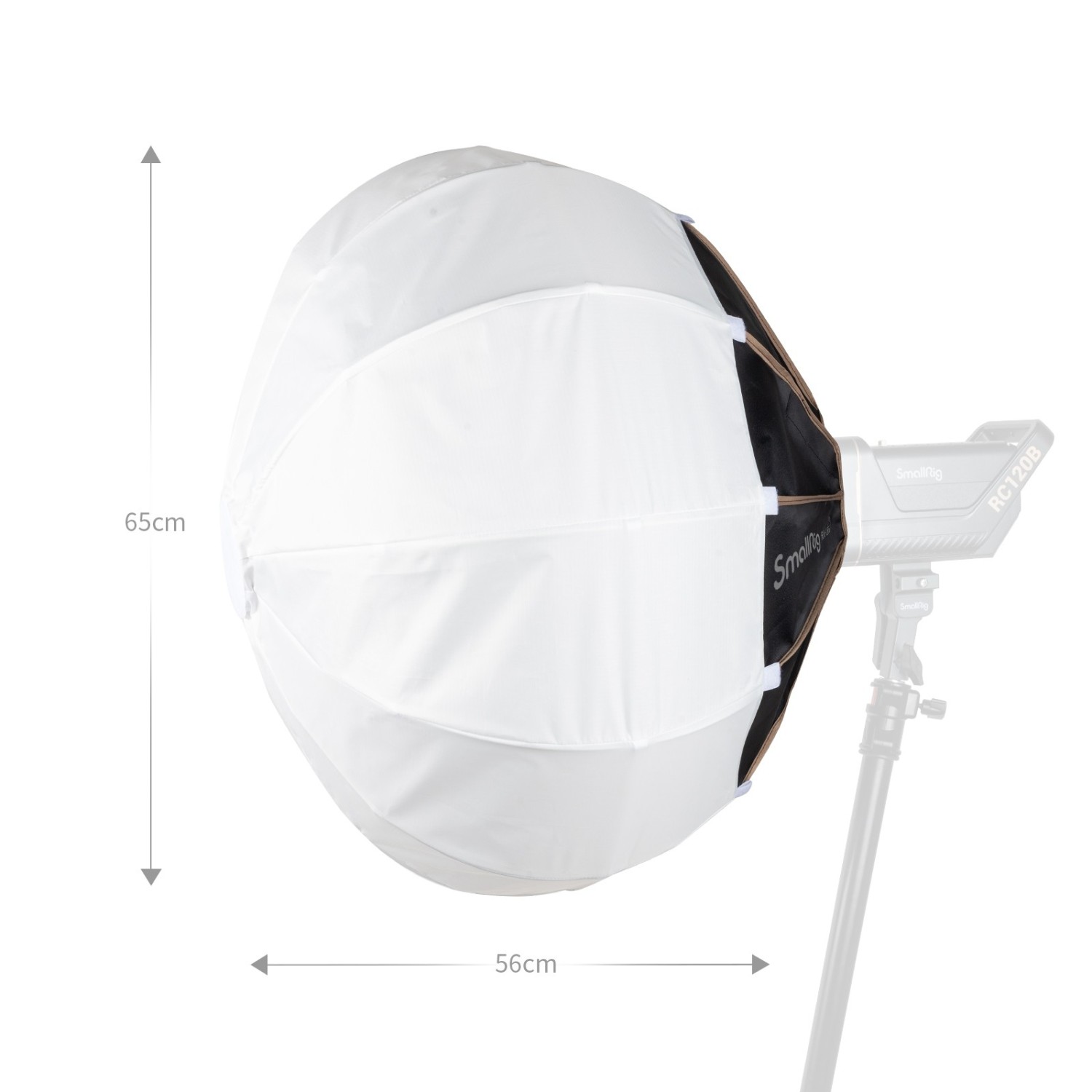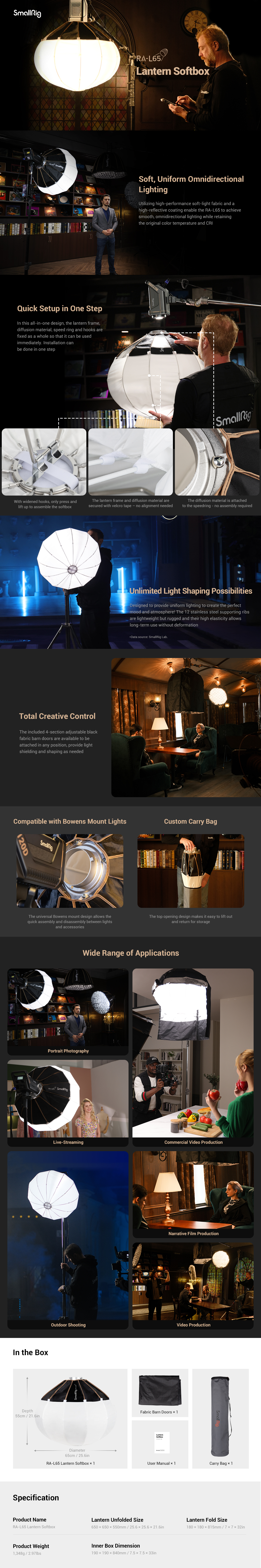 El softbox SmallRig RA-L65 Lantern 3754 es un accesorio versátil con un diámetro de 65 cm. Su ángulo de haz de 270° y su tejido suave de calidad industrial te garantizan un efecto de luz más uniforme y suave.