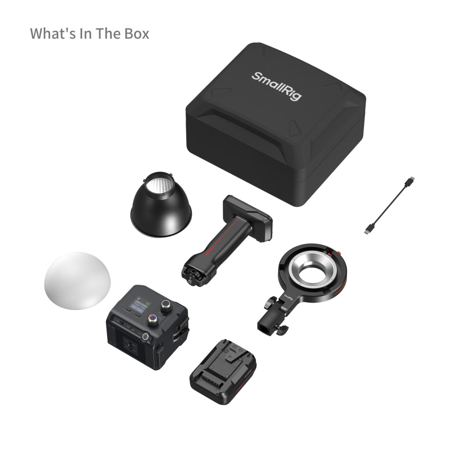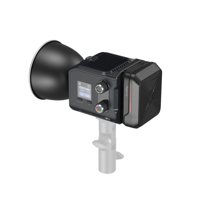 El dispositivo ofreceopciones de alimentación versátiles, tanto inalámbricas como por cable, lo que permite grabar sin interrupciones. Se puede cargar mediante un adaptador de alimentación de CC con una potencia de entrada de hasta 110 W, o a través del puerto USB-C con una potencia de entrada de hasta 110 W para cargar mediante accesorios como el SmallRig 73Wh Power Grip, baterías externas PD, cargadores PD, etc. Se pueden conectardos baterías NP-F970 a la luz. Además, la luz incluye una base V-lock compatible con baterías V-mount estándar.