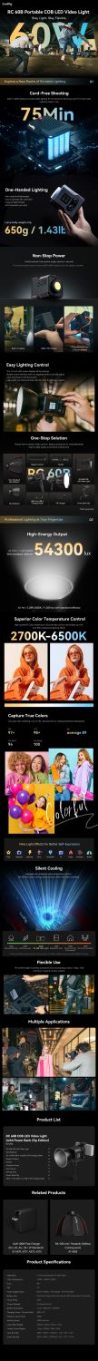 La SmallRig RC 60B es una nueva generación de luces de vídeo LED COB lanzada al mercado por SmallRig. Gracias a un nuevo sistema de gestión de la alimentación y la refrigeración desarrollado internamente, esta nueva luz LED cuenta con una batería integrada que ofrece una autonomía de 45 minutos a máxima potencia, al tiempo que mantiene unas dimensiones compactas y un peso reducido. El cuerpo principal está fabricado en PC+ABS ignífugo de clase V0 y cuenta con una base metálica que reduce el peso en un 30 % y garantiza una gran durabilidad durante el uso. El producto pesa solo 650 g, o aproximadamente 1,1 kg con el asa y el minisoftbox D30, lo que hace que la luz LED sea ideal para la fotografía y la grabación de vídeo en movimiento.  La iluminación de 1 m/5600 K (fuente de luz desnuda) alcanza los 2670 lux y los 11 200 lux en combinación con el mini hiperreflector de 45°. Los indicadores avanzados permiten una reproducción del color más precisa y la recreación del espectro solar: el CRI alcanza 97+, el TLCI 98+, el SSI medio alcanza 89, el TM-30 Rf 96 y el TM-30 Rg 100. Los botones de control independientes CCT/INT y la pantalla LED de 1,3" ayudan a ajustar los parámetros de la luz de forma precisa y rápida. Este producto incluye accesorios para el control de la luz (mini hiperreflector/mini softbox opcional), accesorios de montaje (soporte de luz/asa), accesorios de alimentación (soporte para batería externa opcional y cable USB-C a USB-C de 20 cm) y una bolsa de transporte. Se trata de una solución integral que satisfará tus requisitos de calidad de luz, portabilidad, alta eficiencia, control preciso de la luz, fácil instalación, larga duración de la batería, etc.