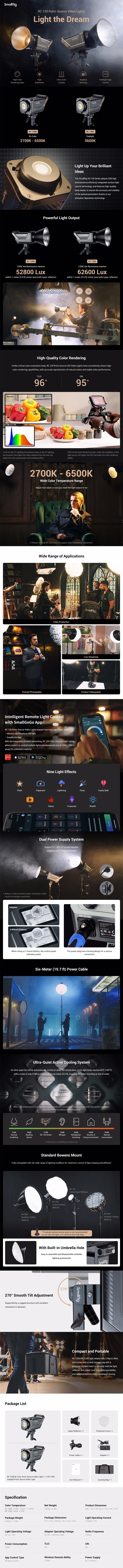 El SmallRig RC120D (3612) es un representante de la primera generación de luces LED profesionales de estudio de la marca SmallRig. Utiliza la moderna tecnología LED COB (Chip-On-Board) para ofrecer una alta intensidad (5.370 lux), así como un reflector de alta eficiencia para alcanzar una intensidad de hasta 62.600 lux en el centro del haz luminoso a una distancia de 1 m. También ofrece una alta precisión cromática (CRI 95+, TLCI 96+), una montura Bowens para facilitar el montaje de accesorios estándar (softboxes, etc.) y nueve efectos integrados (Paparazzi, Firework, Lightning, Fault Bulb, TV, Breath, Flash, Party, Flame), que se pueden controlar, junto con el ajuste continuo de la intensidad, tanto de forma manual como de forma inalámbrica mediante la aplicación SmallGoGo. La variante RC120D tiene una temperatura de color fija de 5600 K (+/- 200 K) y una intensidad máxima de 5370 lx o 62 600 lx con el reflector instalado.