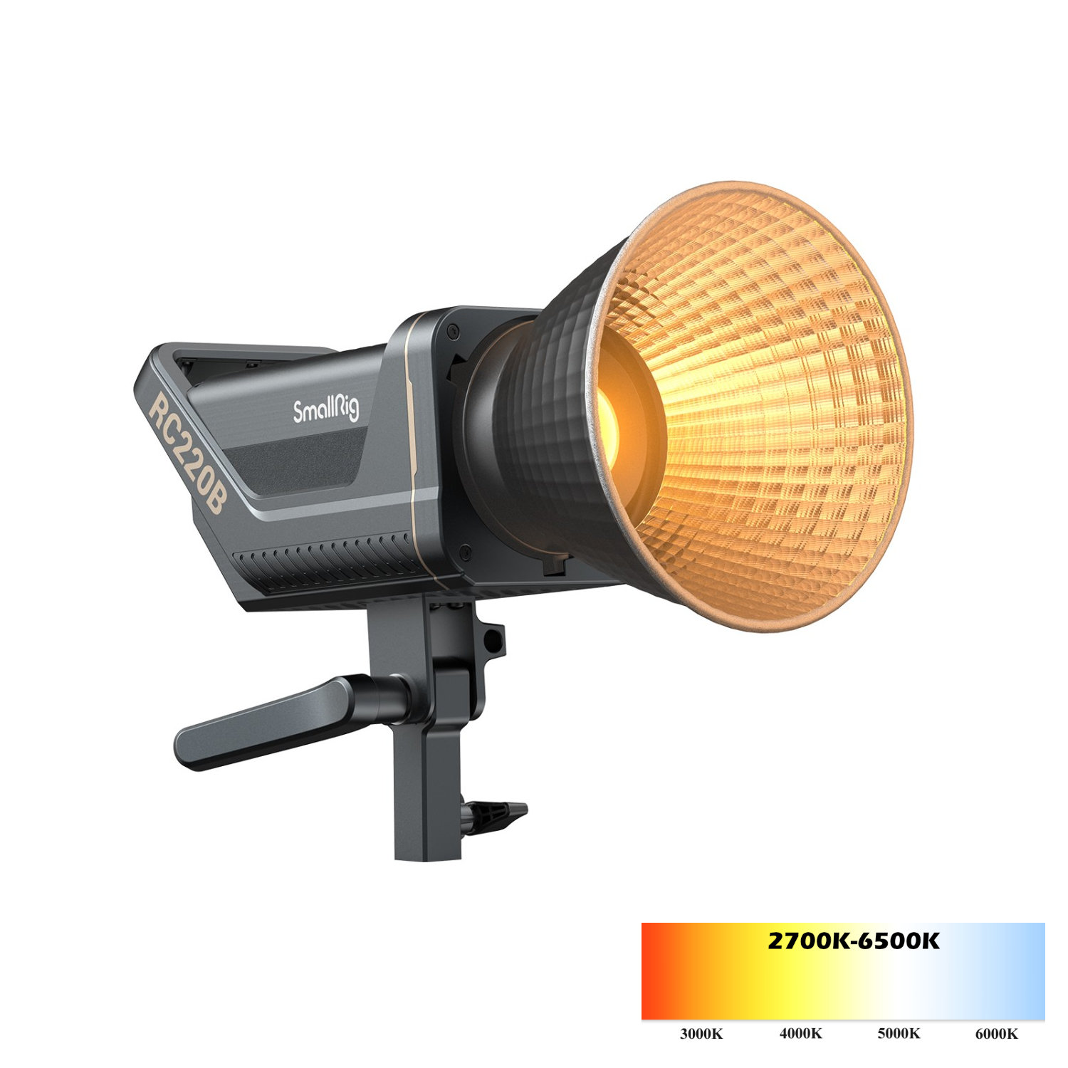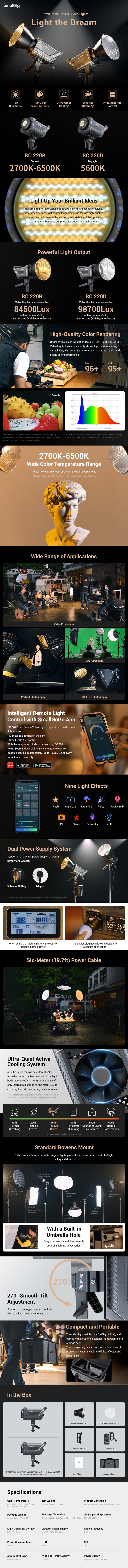El SmallRig RC220B (3621) es otro representante de la primera generación de luces LED profesionales de estudio de la marca SmallRig. Utiliza la moderna tecnología LED COB (Chip-On-Board) para ofrecer una alta intensidad (8.670 lx a 5600 K), así como un reflector de alta eficiencia para alcanzar una intensidad de hasta 84.500 lx en el centro del haz luminoso a una distancia de 1 m. También ofrece una alta precisión cromática (CRI 95+, TLCI 96+), una montura Bowens para facilitar el montaje de accesorios estándar (softboxes, etc.) y nueve efectos integrados (Paparazzi, Firework, Lightning, Fault Bulb, TV, Breath, Flash, Party, Flame), que, junto con el ajuste continuo de la intensidad, se pueden controlar tanto manualmente como de forma inalámbrica mediante la aplicación SmallGoGo. La variante RC220B tiene una temperatura de color ajustable en un rango de 2700-6500 K (+/- 200 K) y una intensidad máxima de 8670 lx o 84 500 lx con el reflector instalado.