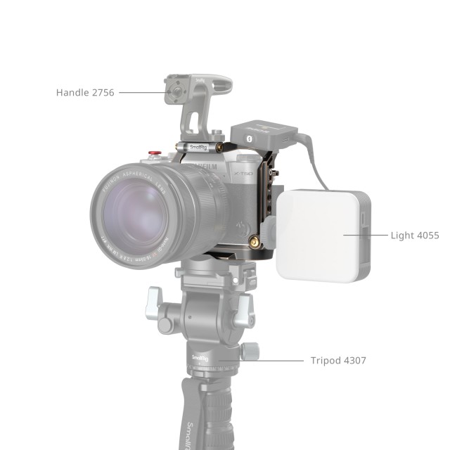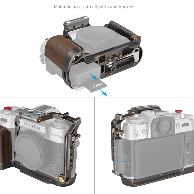 La jaula SmallRig «Retro» para la FUJIFILM X-T50 4714 está diseñada para proteger la cámara y ofrecer varias interfaces de ampliación que facilitan la creación de contenido. El cage de estilo retro se fija a la cámara mediante un tornillo de 1/4"-20 en la parte inferior y un cierre lateral en el lado izquierdo; las almohadillas de silicona evitan que se raye. El asa ergonómica de madera integrada garantiza un agarre firme. La carcasa ofrece libre acceso a los botones de la cámara, las ranuras para tarjetas, la pantalla LCD, el interruptor MCS, la batería, etc. La carcasa cuenta con varias interfaces integradas que satisfarán todas tus necesidades: orificio roscado de 1/4"-20, orificio de posicionamiento ARRI de 3/8"-16, soporte para zapata fría, orificio para correa, etc.