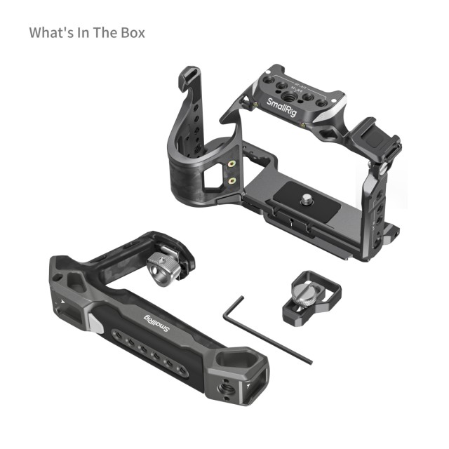 El kit incluye la jaula «Rhinoceros», el asa superior «Rhinoceros» y una abrazadera para el cable HDMI. La jaula y el asa superior están fabricadas en fibra de carbono, son extremadamente ligeras y portátiles, lo que las hace ideales para un uso manual prolongado.