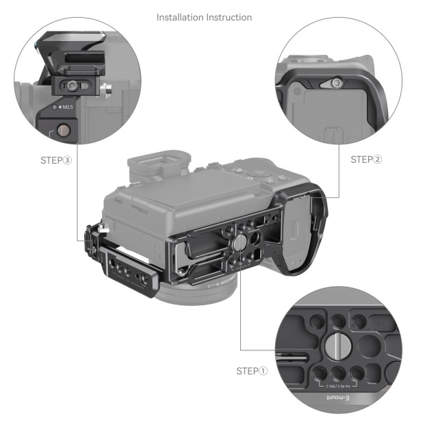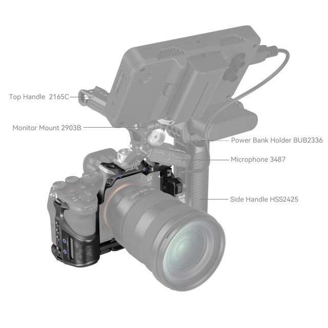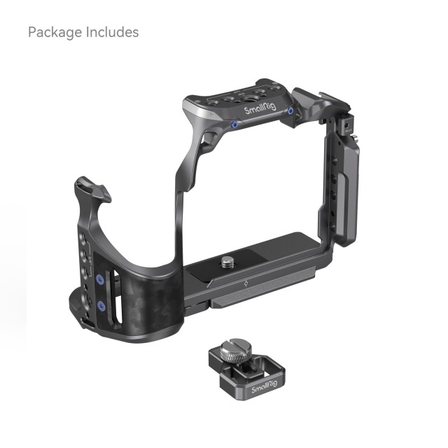 El kit de jaula SmallRig «Rhinoceros» para Sony Alpha 7R V / Alpha 7 IV / Alpha 7S III 4308 está diseñado para fijar accesorios y proteger la cámara y el puerto HDMI. La jaula fija la cámara de forma segura mediante un pasador de posicionamiento, un tornillo de 1/4"-20 y un tornillo M2,5. Presenta un diseño limpio y simplificado que permite un acceso total a los botones superiores. La abrazadera del cable HDMI se aprieta mediante un tornillo de cabeza plana, lo que protege la interfaz y garantiza una transmisión estable de la señal.
