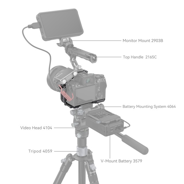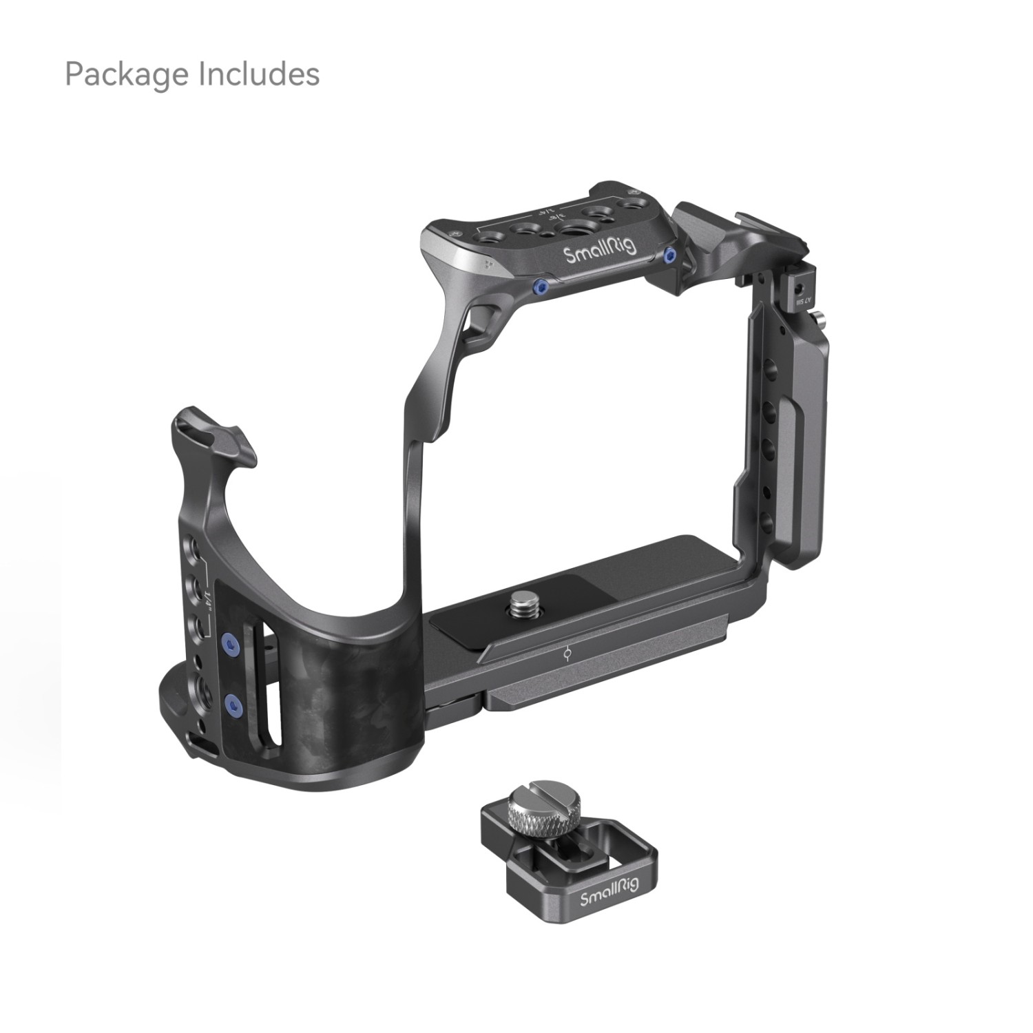 Hay varios puntos de montaje disponibles para fijar otros accesorios, incluyendo orificios roscados de 1/4"-20 y orificios de posicionamiento ARRI de 3/8"-16 para el asa superior 2165C, el asa lateral 2093C, un orificio de posicionamiento ARRI 3/8"-16 superior para el soporte de monitor 2903B, soportes de zócalo frío para micrófono, luz LED de vídeo y ranuras QD inferiores para la correa de hombro. La placa de fijación rápida Arca-Swiss en la parte inferior es compatible con los estabilizadores DJI RS 2 / RSC 2 / RS 3 / RS 3 Pro, la placa de fijación rápida del estabilizador DJI RS 2 / RSC 2 (almohadilla para aumentar la altura) y la placa de fijación rápida Arca-Type 3154. Este artículo también cuenta con orificios para correas a ambos lados y en la parte inferior, compatibles con la correa de mano 3848, la correa para el hombro PSC2428, etc. Además, el paquete incluye una llave magnética para facilitar el desmontaje y el montaje.