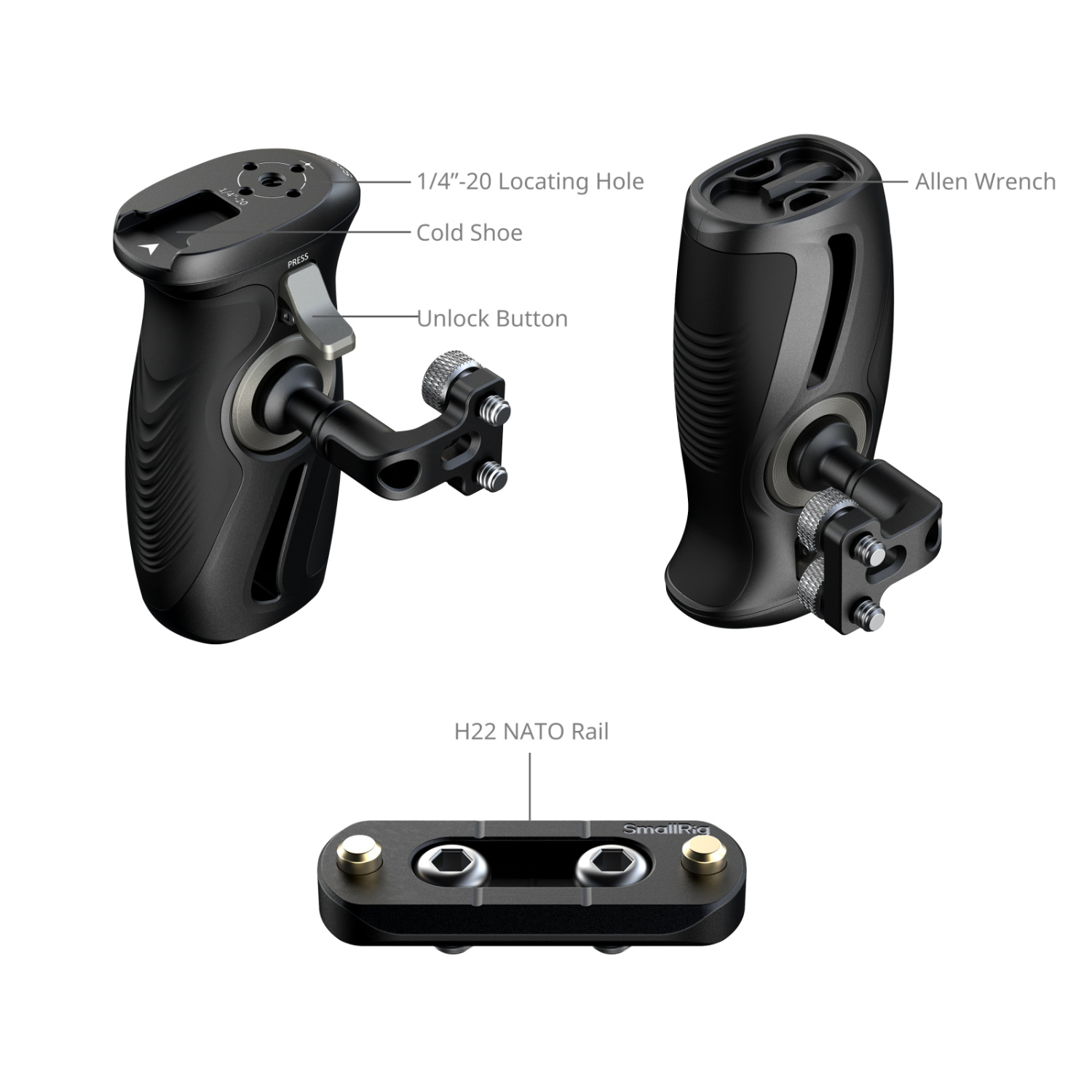 La empuñadura lateral giratoria SmallRig con tornillos de 1/4"-20 5194 está diseñada para facilitar la fotografía a mano alzada.