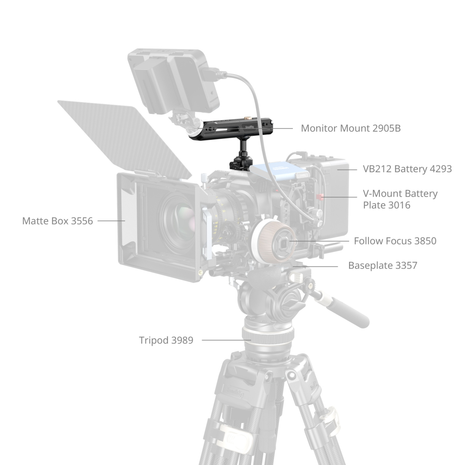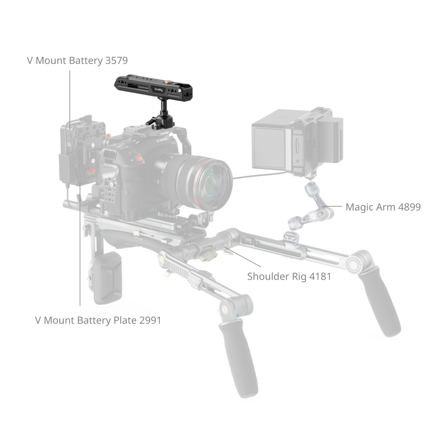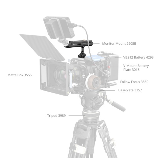 La empuñadura alargada (162 mm / 6,3 pulgadas) está equipada con almohadillas de silicona integradas que proporcionan un agarre cómodo y seguro, adecuado incluso para usuarios con manos más grandes. Las múltiples interfaces de montaje aumentan la versatilidad, incluyendo orificios de fijación ARRI de 3/8"-16 para soportes de monitor (ID 2093B), orificios roscados de 1/4"-20 y orificios de fijación para accesorios como mandos a distancia (ID 3902) y brazos mágicos (ID 3873), así como pies de montaje para soportes de monitor (ID 2905B), micrófonos (ID 3487) y luces de vídeo (ID 3286B).