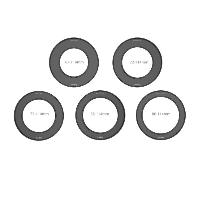 El juego de anillos reductores roscados SmallRig (67 mm/72 mm/77 mm/82 mm/82 mm/86 mm) para el Matte Box 2660 3410 incluye cinco anillos reductores y una bolsa de almacenamiento con cordón. El anillo adaptador se atornilla de forma segura a la parte delantera del objetivo y está equipado con roscas para filtros, lo que permite colocar filtros circulares, como filtros ND variables y filtros CPL, en la parte delantera del anillo adaptador. Además, los anillos adaptadores están diseñados con un reborde antirrotación que evita que se suelten accidentalmente cuando se utilizan en combinación con un matte box, lo que garantiza la seguridad.