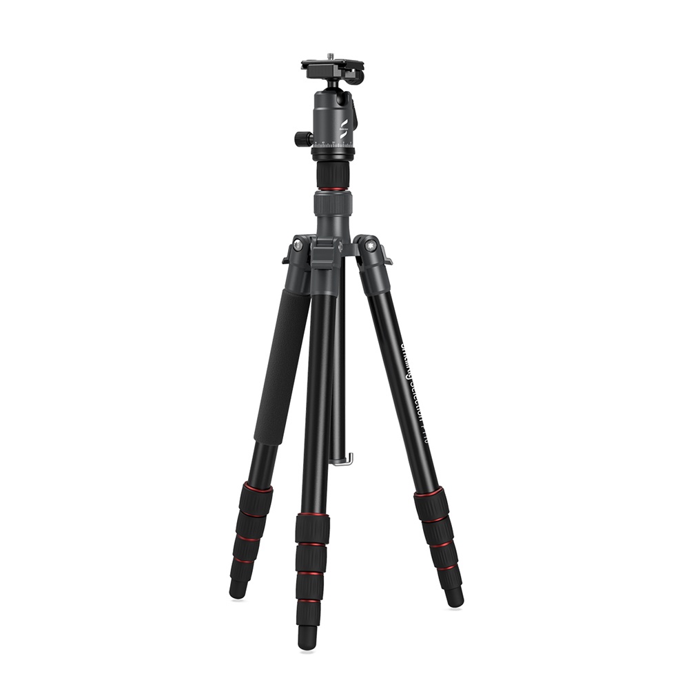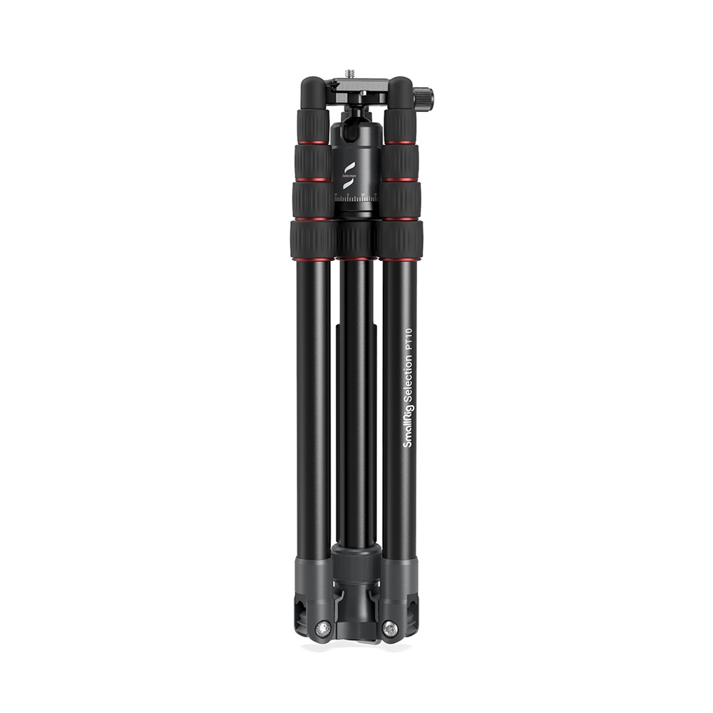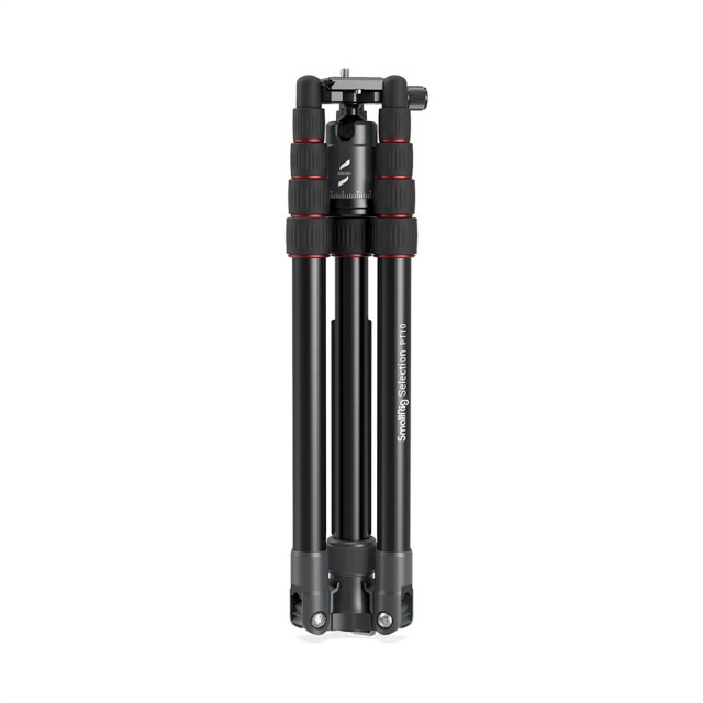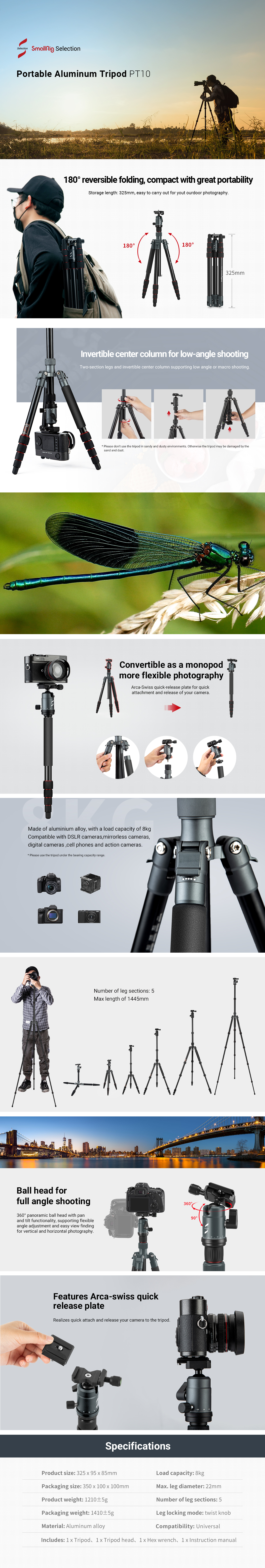 El trípode portátil de aluminio para cámara SmallRig Selection PT10 3257 está fabricado en aleación de aluminio y tiene una capacidad de carga segura de 8 kg. El trípode es compatible con cámaras réflex digitales, cámaras sin espejo, etc. Sus patas de cinco secciones, aseguradas con cierres giratorios, permiten una altura máxima de trabajo de 1445 mm y una estabilidad excelente. Está equipado con un sistema de plegado inverso que permite reducir la longitud del trípode plegado a tan solo 325 mm, lo que facilita su transporte. Su columna central giratoria de dos secciones permite realizar tomas en ángulo bajo y macro. El monopié desmontable aporta una gran flexibilidad. El trípode está equipado con una rótula que permite la captura panorámica y una placa de fijación rápida tipo Arca-Swiss para cambiar rápidamente entre el disparo a mano alzada y el disparo con trípode.