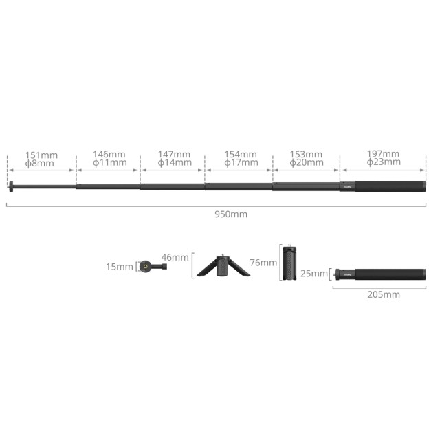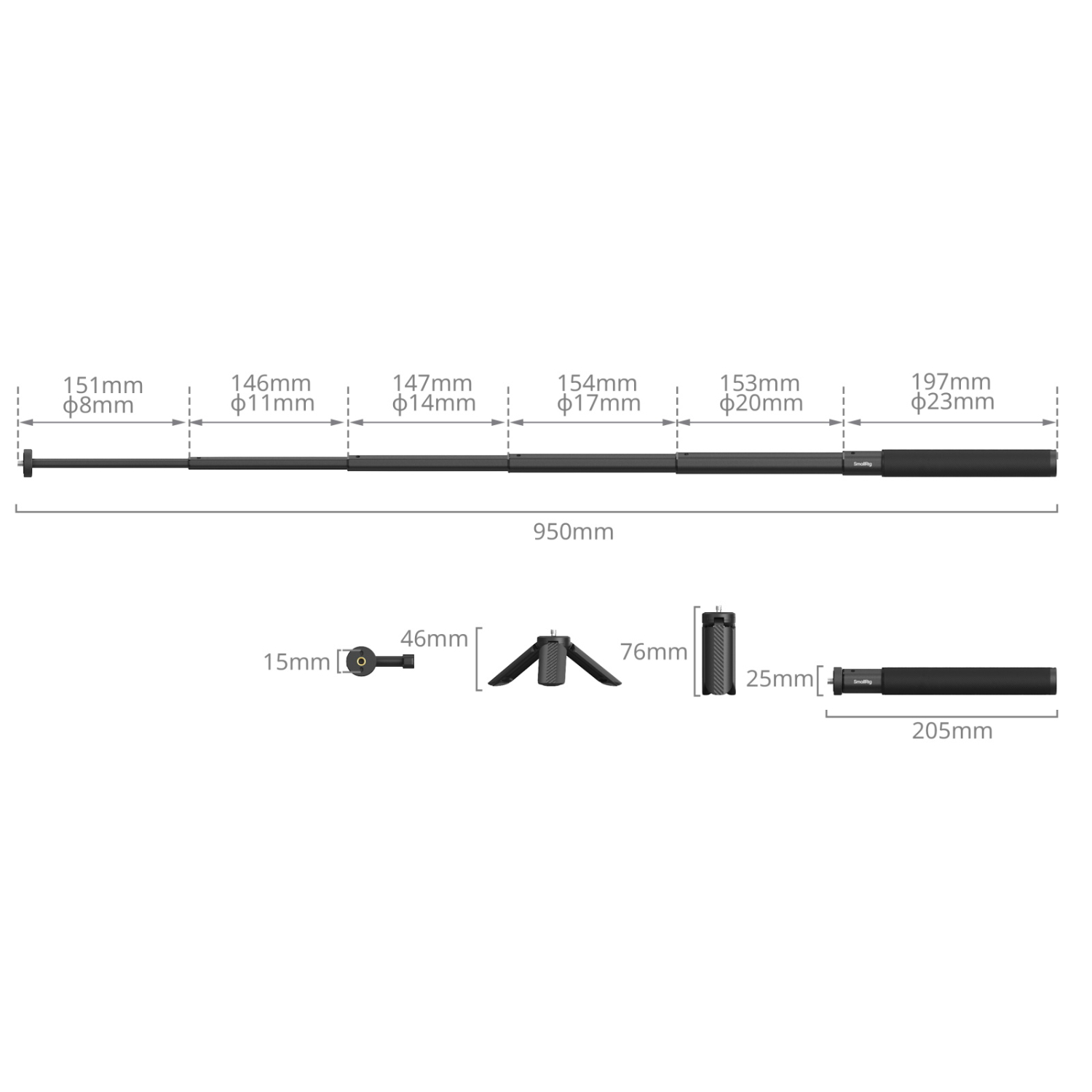 El palo selfie SmallRig para cámaras de acción 5403 incluye un palo selfie, una pinza para el teléfono inteligente, un soporte para la cámara de acción, un trípode y una correa para la muñeca. Este artículo está fabricado en aleación de aluminio de calidad aeronáutica para mayor resistencia y durabilidad, y cuenta con secciones hexagonales extensibles que evitan que la cámara de acción se tuerza, lo que la hace más estable. Este palo de tamaño de bolsillo, que se puede extender hasta 95 cm y plegar hasta solo 20 cm, también viene con varios accesorios para smartphones y cámaras de acción, como la GoPro HERO13 Black, la Insta360 X5, la DJI Action 5 Pro y la AKASO. Especialmente al usar la cámara Insta360 X4, puedes eliminar el palo de las fotos y los vídeos. Entre los accesorios se incluye una correa de muñeca que ayuda a mantener este palo y la cámara de forma segura en tu muñeca para garantizar la seguridad; un trípode, que tiene un tornillo de 1/4"-20 en la parte superior, se acopla a este palo a través de su orificio inferior con rosca de 1/4"-20, para que puedas tomar fotos de grupo, tomas fijas, etc.