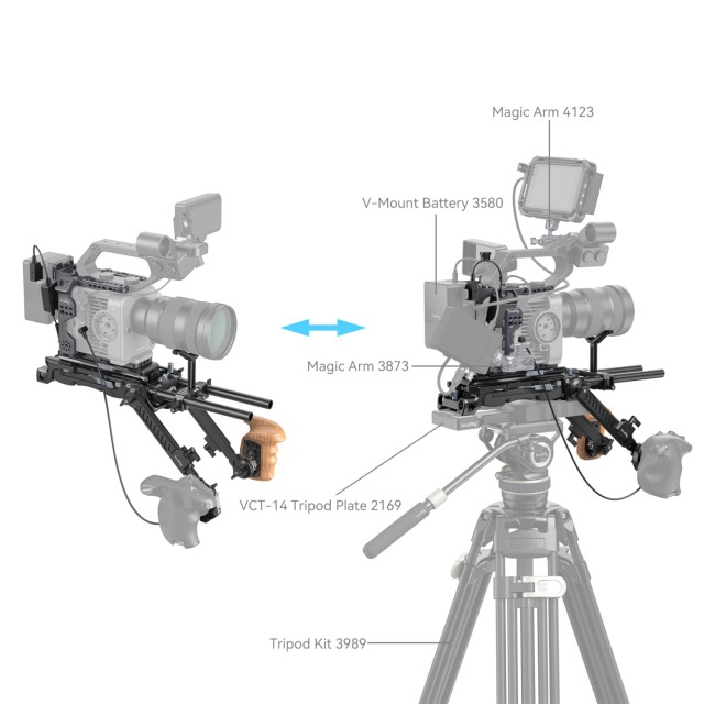 2. Placa base VCT-14 de fijación rápida integrada para cambiar rápidamente entre el modo de hombro y el modo de trípode.