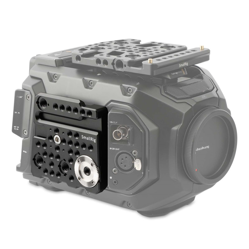 La placa lateral SmallRig para Blackmagic Design URSA Mini/Mini Pro/Mini Pro G2 APS1854 es una placa multifuncional que se monta en el lado derecho de la cámara. Incorpora puntos de montaje que incluyen orificios roscados de 1/4''-20 y 3/8''-16, orificios de referencia ARRI, un soporte de zapata fría y un riel NATO. Antes de instalar la placa, retire la roseta original de la cámara y fíjela a esta placa; fije la placa a la cámara con tres tornillos M2,5 y un pasador antirrotación. En el interior también cuenta con almohadillas de goma que evitan los arañazos.