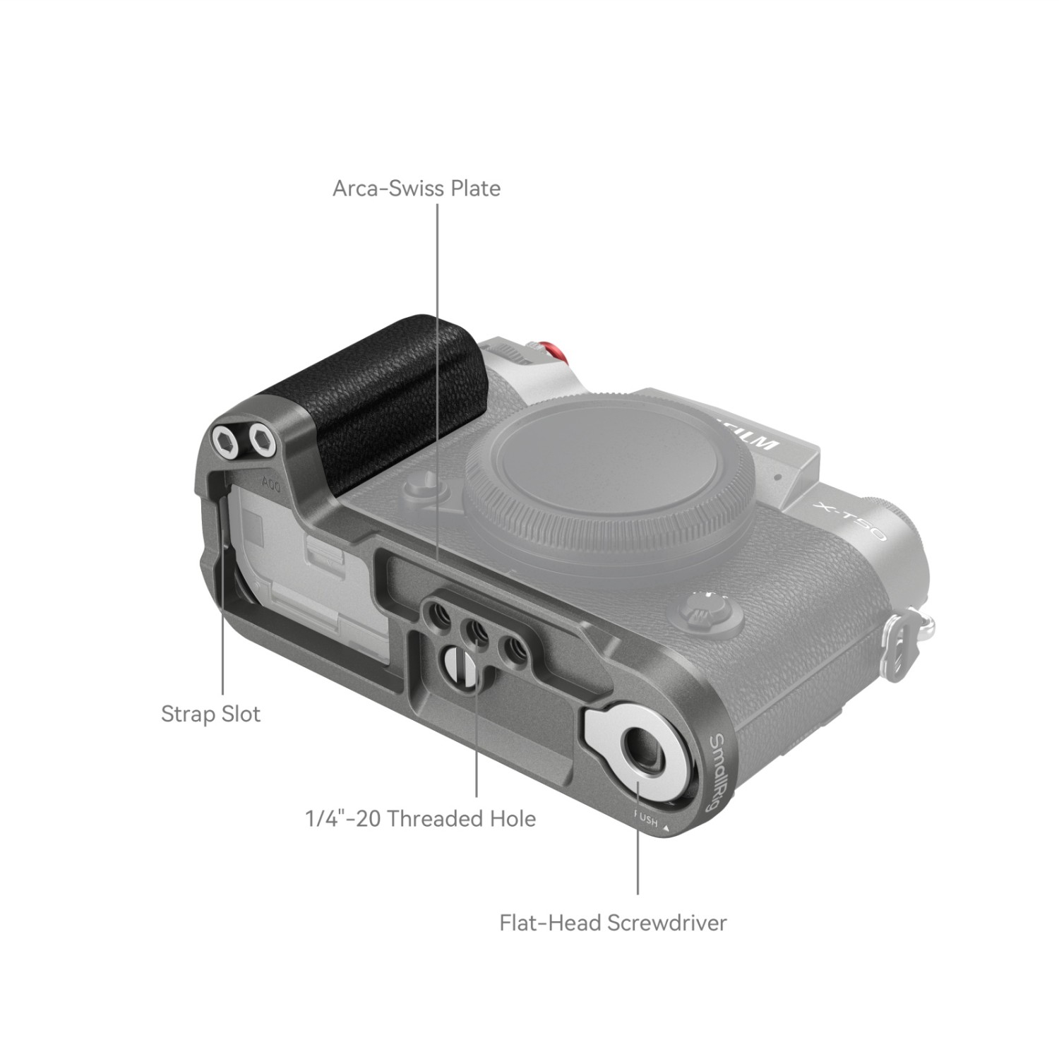 La empuñadura de silicona SmallRig en forma de L para la cámara FUJIFILM X-T50 (Charcoal Silver) 4712 está diseñada para mejorar el agarre de la cámara. La empuñadura en forma de L se fija a la cámara mediante un tornillo de 1/4"-20 en la parte inferior, y las almohadillas de silicona integradas evitan que se raye. La textura y el color de la empuñadura combinan a la perfección con la cámara FUJIFILM X-T50. La placa base de fijación rápida Arca-Swiss integrada permite un montaje y desmontaje fácil y rápido de trípodes de tipo Arca. Cuatro orificios roscados de 1/4"-20 en la parte inferior para fijar placas y trípodes de tipo Manfrotto. Ranura para correa de muñeca (ID: 3848). Llave plana integrada en la parte inferior para un montaje y desmontaje sencillo de los accesorios. La empuñadura se suministra con una exclusiva cubierta para la zapata con el estampado de la onda sonora «FUJIFILM» y el año de fundación, como homenaje a la empresa FUJIFILM. También incluye un botón de disparo que garantiza un tacto suave y cómodo para los dedos.