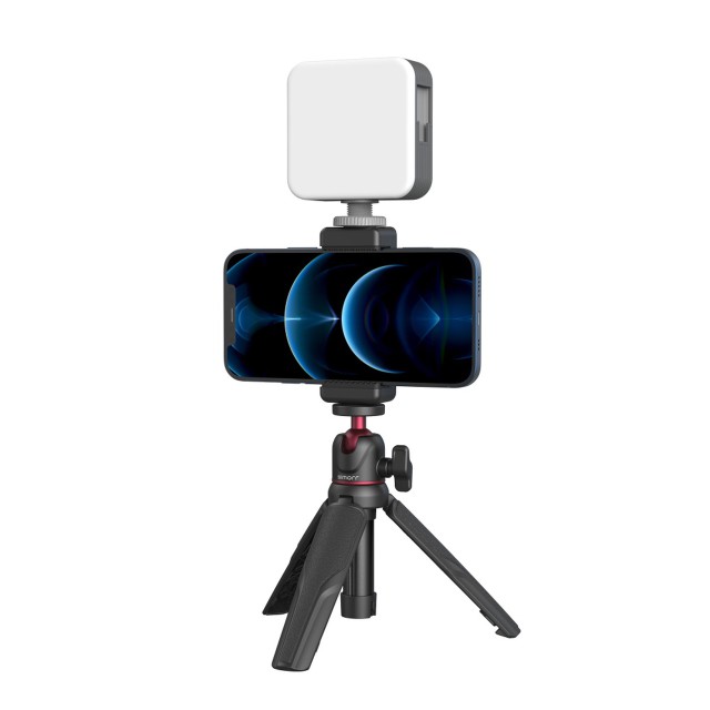 El kit Smallrig Simorr Vigor VK-30 Vlog Kit 3509 se compone de un trípode portátil para vlogs, un clip estándar para el teléfono y una luz LED Vibe P96, por lo que resulta compacto y fácil de transportar. El trípode se fija al clip para el teléfono mediante un tornillo de 1/4, y el clip para el teléfono se fija a la luz mediante una zapata estándar en la parte superior; además, la luz cuenta con 3 orificios estándar que se pueden ampliar para añadir más accesorios. El trípode soporta con seguridad 1,5 kg. La luz LED P96 tiene un rango de temperatura de color de 2700 K a 6500 K y una autonomía máxima de 13,5 horas.