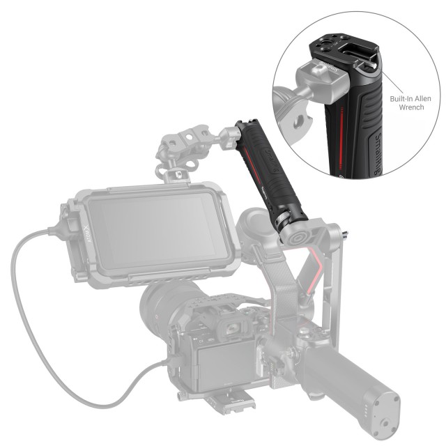La empuñadura tipo bandolera SmallRig para el gimbal DJI RS 2 y RSC 2 (3161) estáespecialmente diseñada para reducir la fatiga de las manos al grabar con el gimbal en ángulos bajos y ofrece puntos de montaje para accesorios. La empuñadura se fija al asa del maletín DJI R mediante un tornillo de 1/4"-20 y cuenta con un borde elevado que evita que se gire. En la parte superior del mango hay dos orificios roscados de 1/4"-20, un orificio de posicionamiento ARRI de 3/8"-16 y un soporte cold shoe para montar el soporte de monitor 2903 o 2905