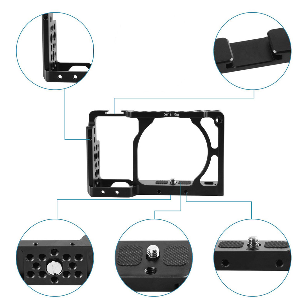 La jaula SmallRig Sony A6000/A6300/A6500 ILCE-6000/ILCE-6300/ILCE-A6500/Nex-7 Cage 1661 es una jaula de aluminio que protege la cámara y ofrece opciones para fijar accesorios.