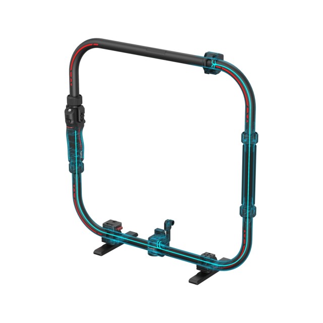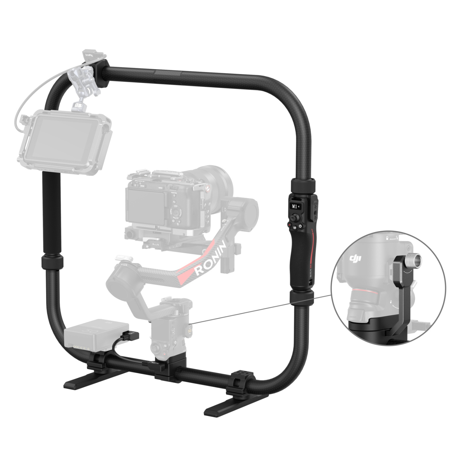 Las diversas opciones de montaje incluyen orificios de fijación de 1/4"-20 y 3/8"-16, junto con dos puertos D-Tap para una amplia gama de accesorios. Además, la base giratoria garantiza una colocación estable durante las pausas en la sesión fotográfica. El asa ergonómica del lado derecho, fabricada en fibra de carbono ligera, aumenta la comodidad durante un uso prolongado y complementa la estética del diseño de DJI.