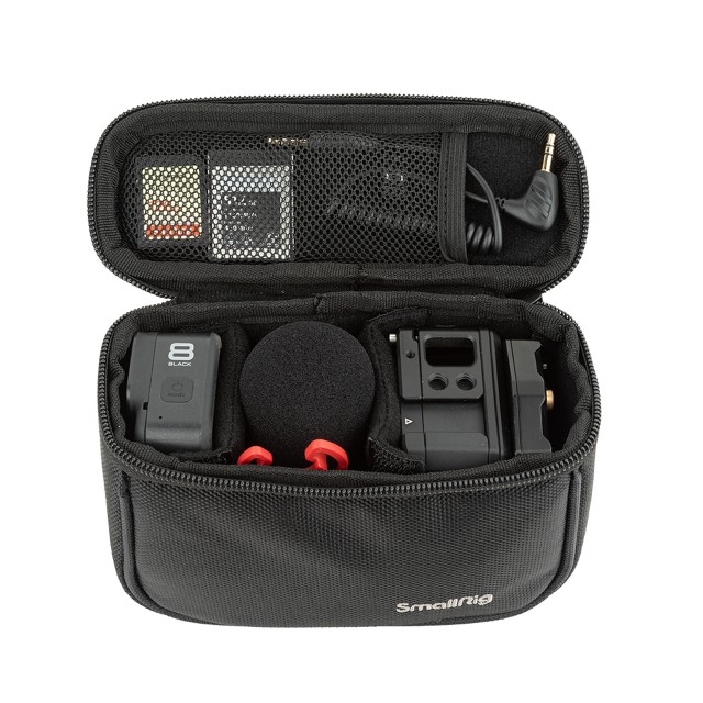 La bolsa de almacenamiento SmallRig 3704 está diseñada para guardar de forma rápida y sencilla los accesorios de la cámara y supone una solución al problema de los accesorios pequeños, que se pierden con facilidad y resultan incómodos de transportar. En la bolsa puedes guardar cámaras 3010 con enfoque automático, cámaras de acción, cámaras compactas como la DJI Insta360 o la GoPro, así como micrófonos, luces LED y baterías pequeñas con puerto V. Cuenta con compartimentos internos para cables de alimentación y comunicación y tarjetas de memoria, así como con un asa de transporte en la parte superior y aberturas laterales para un almacenamiento rápido y sencillo y un uso ordenado y organizado.