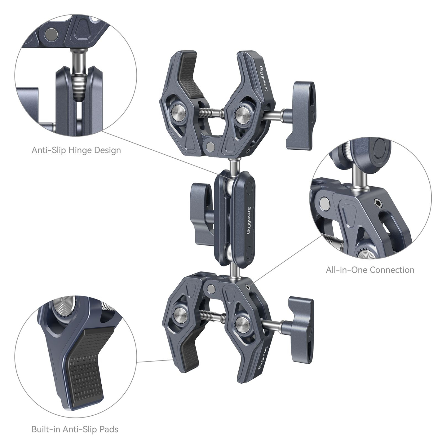 La pinza SmallRig Super Clamp con doble pinza de cangrejo 4103B está fabricada en aleación de aluminio de calidad aeronáutica y acero inoxidable, anodizada y mecanizada mediante CNC para aumentar su robustez y resistencia. Cuenta con una estructura de armazón y una pinza tipo tiburón con mayor fuerza de sujeción, así como orificios roscados de 3/8"-16 ampliamente compatibles. La abrazadera, que admite tubos con un diámetro mínimo de 14 mm y una superficie de hasta 65 mm de grosor, permite fijar rápidamente paraguas, palos selfies, micrófonos, etc., a tubos redondos, mesas, manillares, tubos de trípodes y pasamanos.