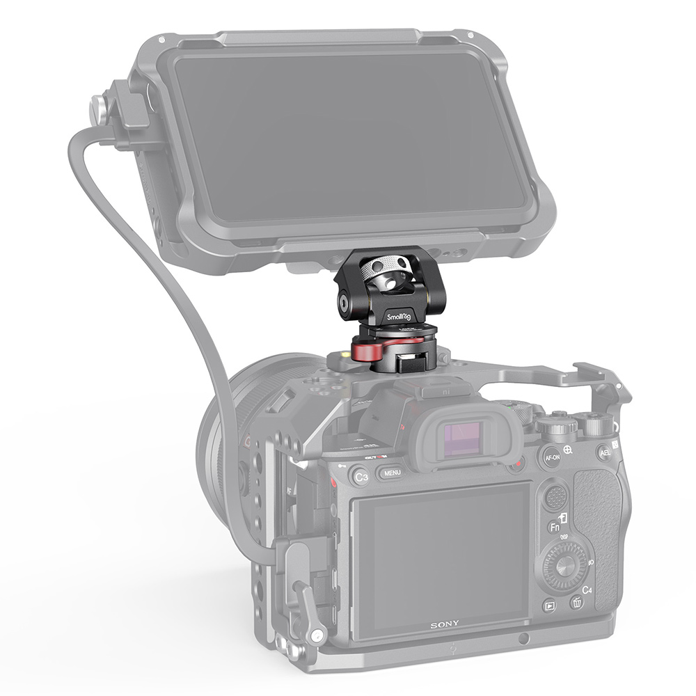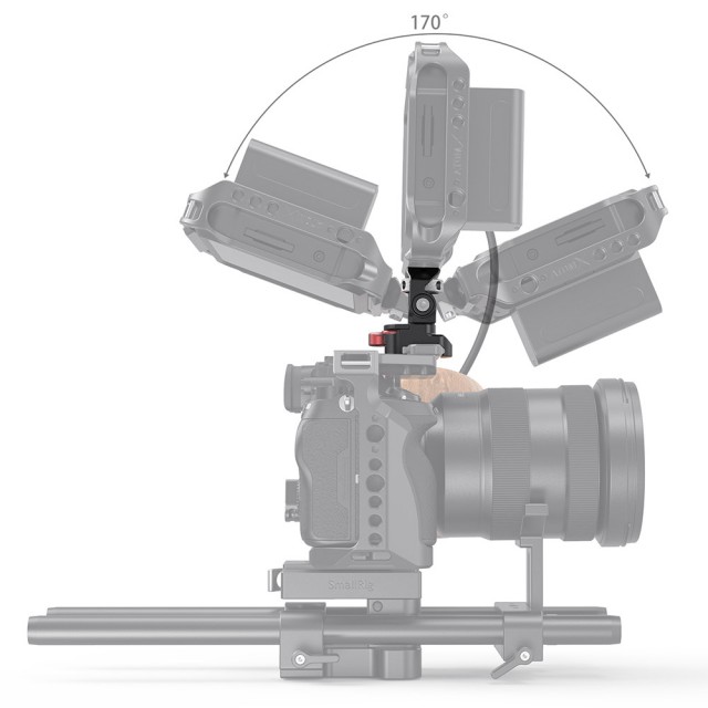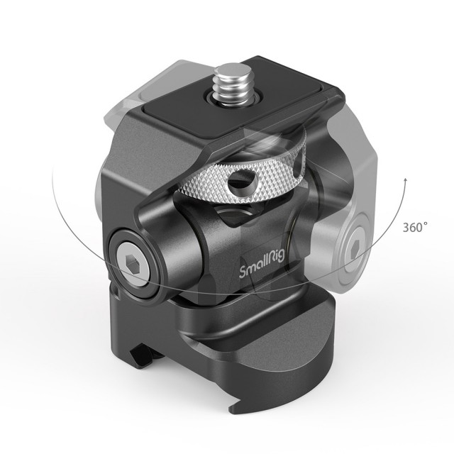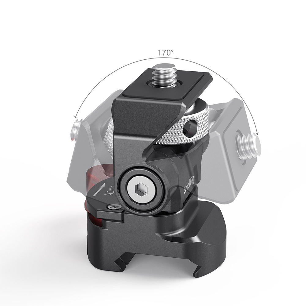 El soporte giratorio e inclinable ajustable para monitor SmallRig con abrazadera NATO Mount 2906 está diseñado para fijar un monitor a una jaula de cámara u otro sistema de montaje mediante una abrazadera NATO. En la parte superior cuenta con un tornillo de 1/4"-20 para fijar el monitor, una luz o un micrófono. El soporte permite girar 360° hacia los lados e inclinarse 170°, con un tope libre en cualquier posición. La tensión de cada eje se puede ajustar con una llave Allen. Este robusto soporte está fabricado en aluminio mecanizado con CNC y soporta monitores de 5" y 7" con un peso de hasta 1,5 kg. El soporte giratorio e inclinable cuenta con un acolchado de goma protector en la parte superior y, para mayor seguridad, incluye una llave Allen para apretar los soportes.