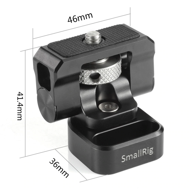 El soporte giratorio e inclinable para monitor SmallRig 2294 está diseñado para fijar un monitor a una jaula de cámara, una empuñadura u otro sistema de montaje mediante dos tornillos de 1/4"-20. Este robusto soporte de aluminio permite girar 360° hacia los lados e inclinarse 150° sin necesidad de herramientas. Este soporte ligero pesa solo 68 g y soporta monitores de 5" y 7" con un peso de hasta 1,2 kg. Está equipado con almohadillas de goma en la parte superior que evitan que se raye el monitor. El tornillo de mariposa cuenta con orificios para una llave hexagonal que permiten volver a apretarlo, garantizando la seguridad de tu monitor. Cuando no utilices el soporte, puedes plegarlo fácilmente y guardarlo.