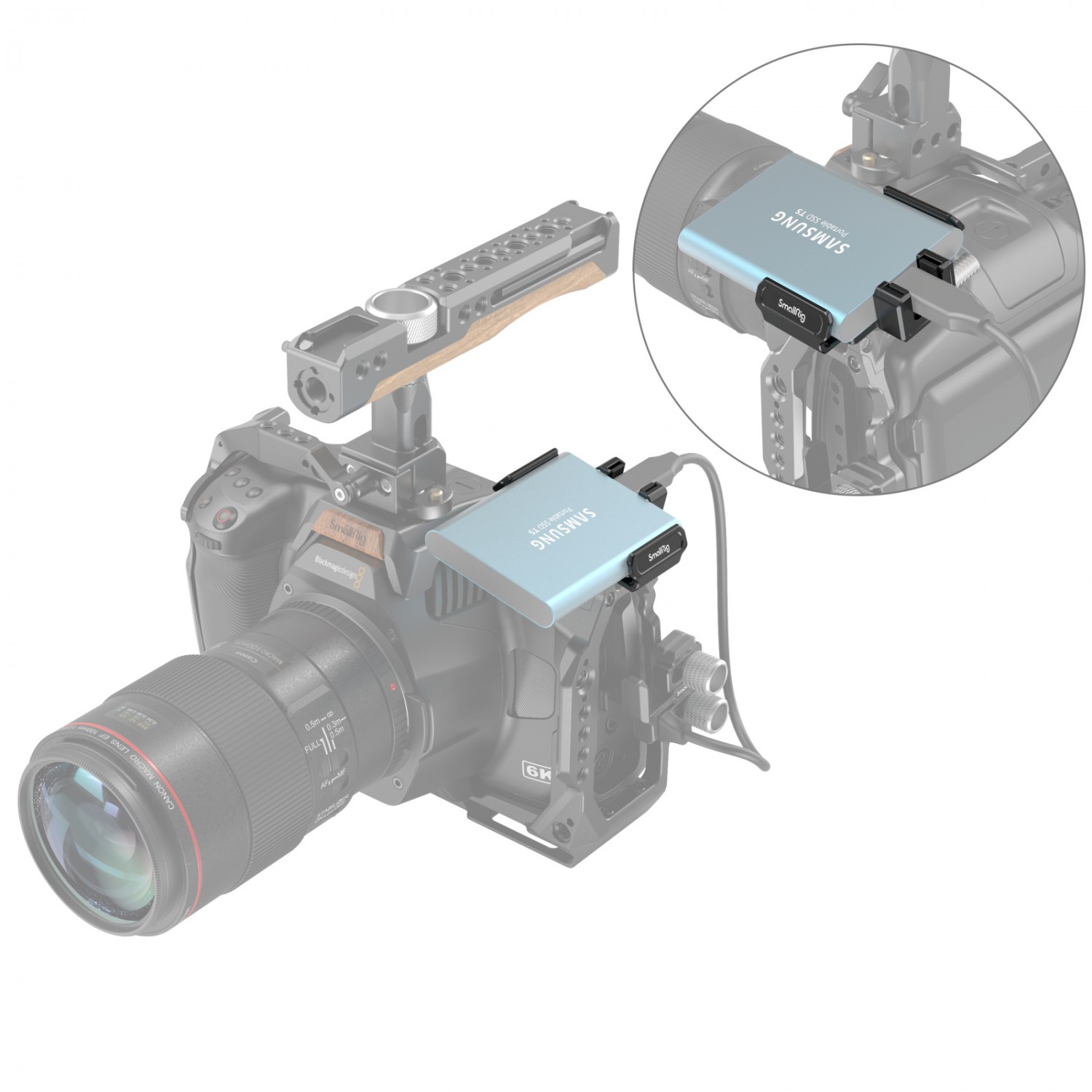 Marco de montaje para discos SSD T5/T7 y jaula de cámara SmallRig 3270 para BMPCC 6K Pro. Se fija a la zapata de flash situada en la parte superior izquierda de la jaula o a la rosca de 1/4"-20 (el tornillo se incluye en el paquete). Gracias a las almohadillas de goma, no se raya el disco; tampoco falta la abrazadera para el cable USB, que se puede apretar o aflojar fácilmente con la mano. Peso: 41 g ±5 g.