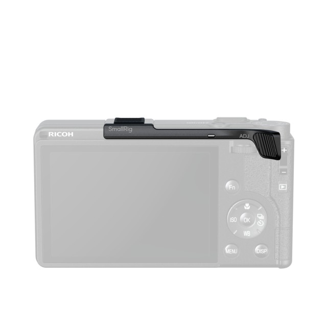 Mejora la comodidad y el control al fotografiar con la Ricoh GR IV gracias a la empuñadura para el pulgar SmallRig 5688. Esta empuñadura, diseñada para instalarse directamente en la zapata de la cámara, añade un punto de apoyo cóncavo para el pulgar, lo que aumenta la estabilidad y reduce la fatiga de la mano durante sesiones fotográficas prolongadas. Su diseño preciso garantiza una integración fluida sin obstaculizar los botones, los controles giratorios ni el manejo de la cámara.