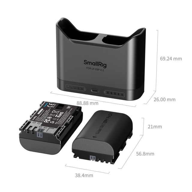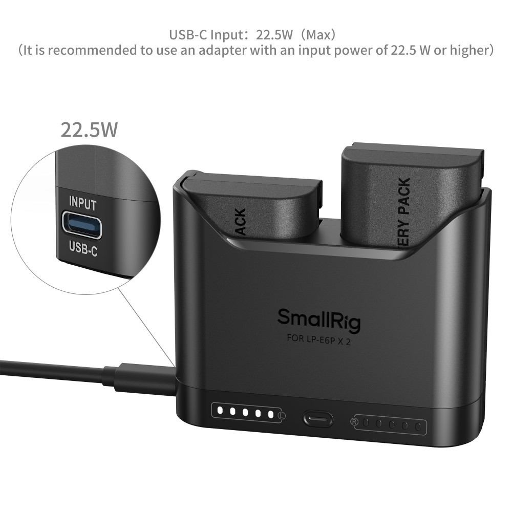 El kit de carga rápida SmallRig Turbo Charging Kit para baterías LP-E6NH para cámaras 5484 incluye dos baterías de alto rendimiento y un cargador rápido de dos canales. Gracias a su chip de decodificación completa, este kit garantiza una compatibilidad total con las baterías Canon LP-E6NH, elimina las advertencias emergentes y permite ver el estado de carga en la cámara, así como utilizar el cargador original.
