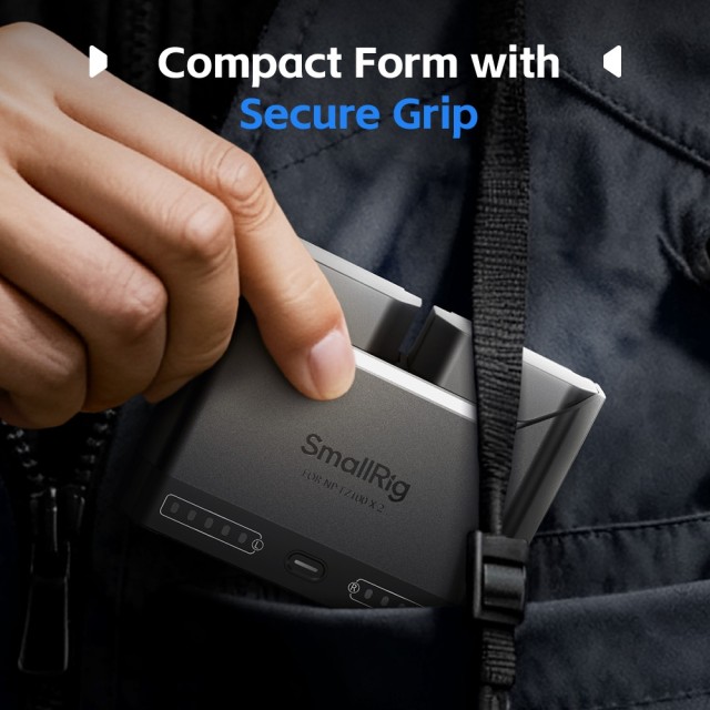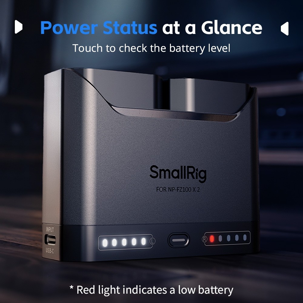 Cada canal de carga está equipado con cinco indicadores LED que muestran el nivel de carga en incrementos del 20 %, incluso sin alimentación externa. La luz roja se enciende cuando el nivel de carga de la batería es críticamente bajo. Además, el cargador incluye un puerto de entrada USB-C universal y se suministra con un cable de carga rápida, lo que lo hace compatible con adaptadores de red, cargadores para coche y baterías externas, ofreciendo así opciones de carga versátiles.