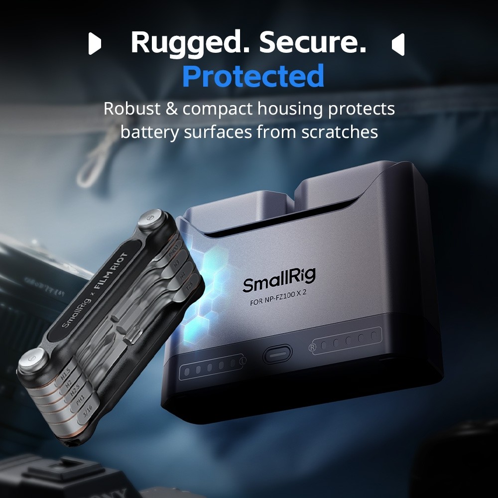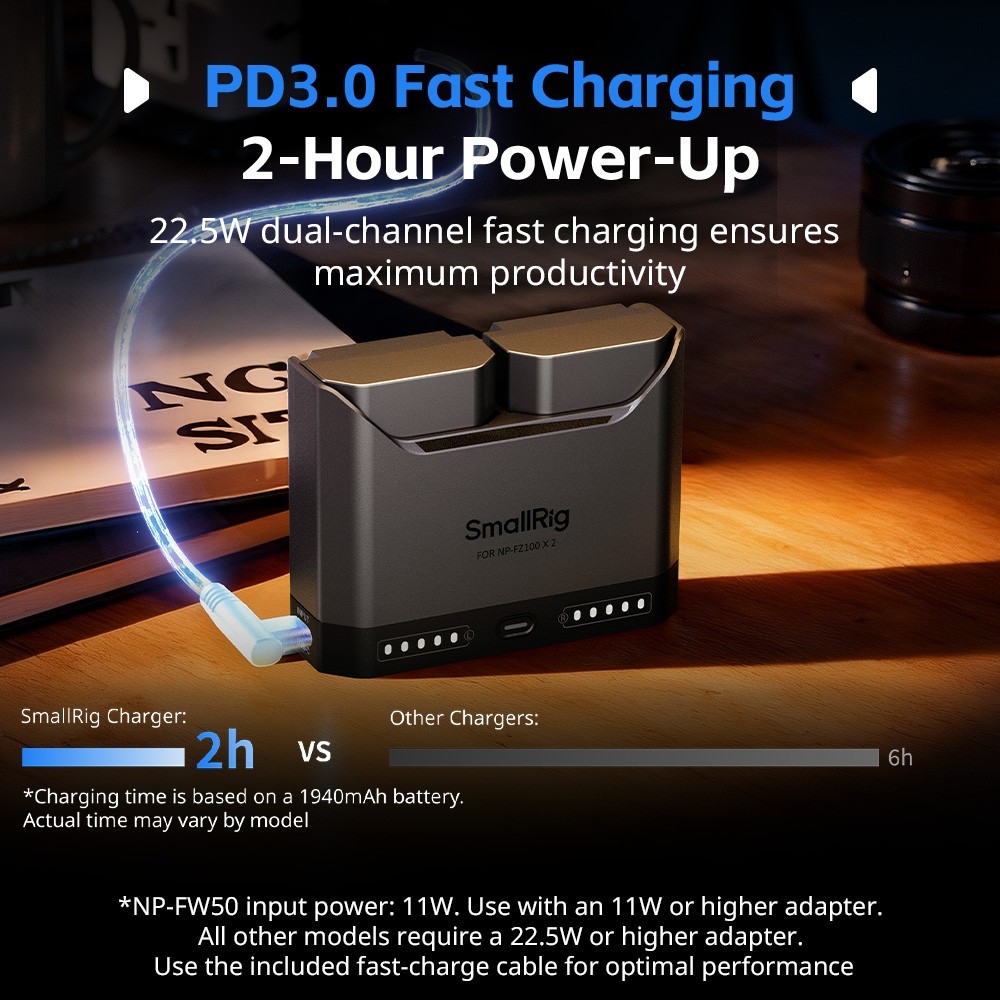 Cada batería ofrece una potencia nominal real de 1030 mAh, lo que garantiza un tiempo de disparo más prolongado para flujos de trabajo exigentes. El diseño de dos ranuras del cargador permite cargar dos baterías simultáneamente o cargar una sola batería; las dos baterías se cargan completamente en aproximadamente 1,5 horas, lo que garantiza una eficiencia óptima.