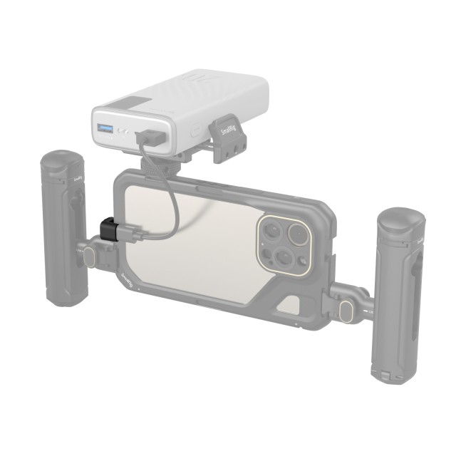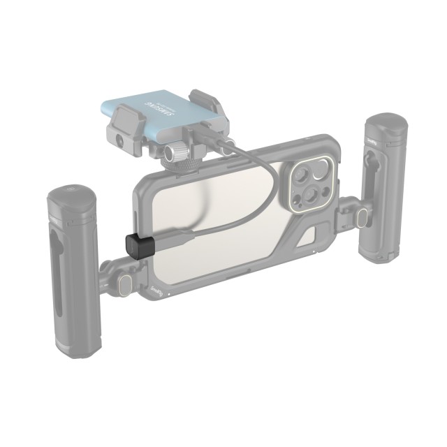 El adaptador SmallRig de Type-C a señal de audio Type-C 4406 es un accesorio para la jaula de vídeo de la serie iPhone 15 Pro. El adaptador traslada la conexión Type-C y la interfaz de alimentación del teléfono móvil al lateral del dispositivo, de modo que este se puede acoplar al asa lateral para grabar en horizontal sin que ello impida el uso del micrófono, la unidad SSD o la alimentación.
