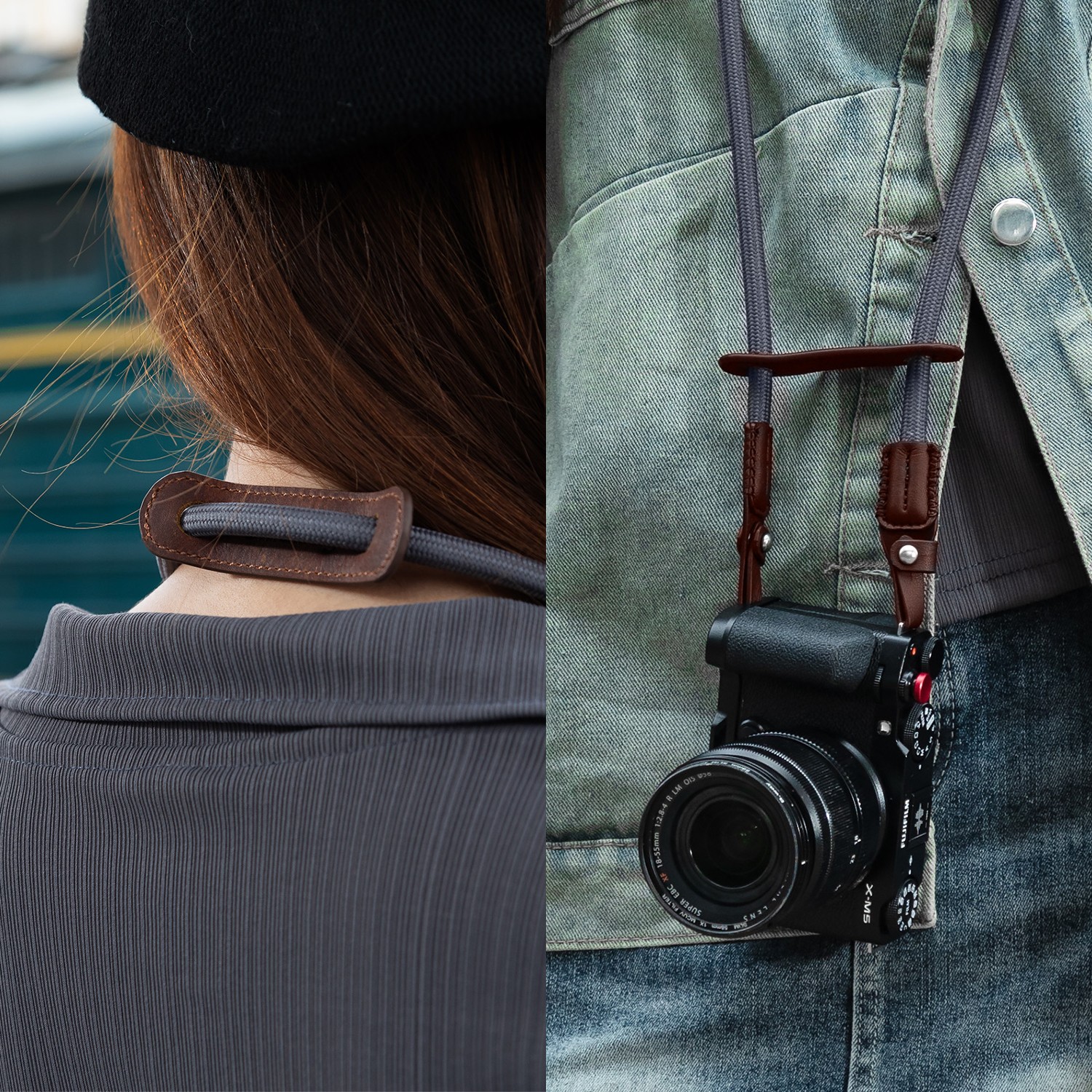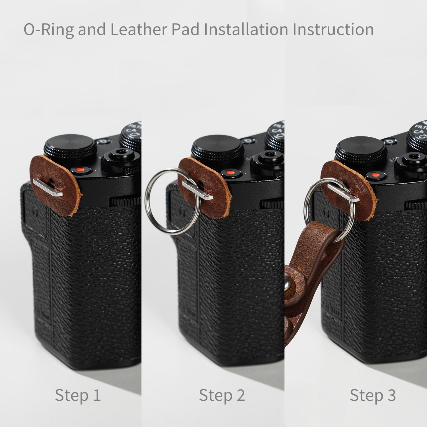 2. Fácil de instalar: basta con pasar la correa de cuero por la presilla de la correa de hombro de la cámara y ya está lista para usar.