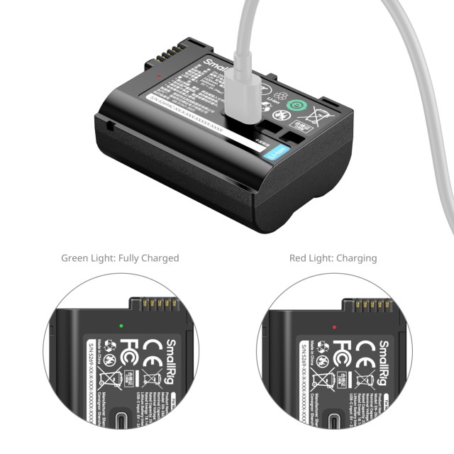 El puerto de carga USB-C integrado permite la carga directa desde baterías externas, adaptadores de red, cargadores para coche o cables alargadores, por lo que no se necesita un cargador especial. La batería admite una entrada de 5 V/2 A y alcanza la carga completa en aproximadamente 2,5 horas. La batería SmallRig EN-EL15c se guarda en un estuche de plástico ligero y resistente al fuego con un diseño duradero e incluye un cable de carga de USB-A a USB-C y una tapa protectora para los contactos, lo que la hace ideal para viajar, para el estudio y para uso sobre el terreno.