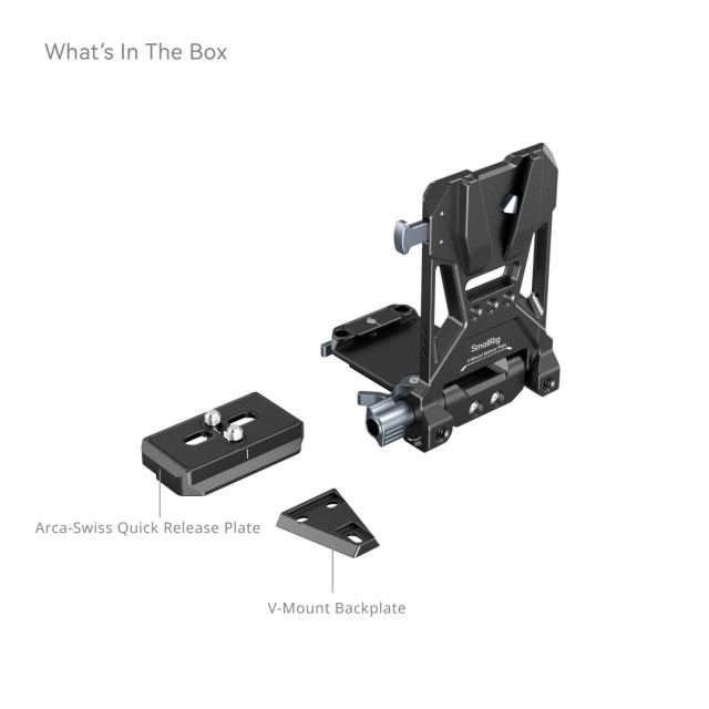 La placa de montaje de batería V-Mount 4505B de SmallRig es una solución todo en uno compacta, ligera y cómoda para fijar baterías V-mount. La placa base se puede extender para adaptarse a cámaras sin espejo y DSLR de diferentes tamaños. La instalación y el ajuste sin herramientas hacen que este proceso sea rápido y no requiera mucho tiempo. La placa de montaje Arca integrada es compatible con todas las jaulas SmallRig con placa Arca-Swiss. Los orificios roscados integrados de 1/4"-20 ofrecen más opciones de alimentación mediante la conexión de una abrazadera de montaje para baterías externas portátiles BUB2336. Los orificios integrados de 1/4"-20 y 3/8"-16 en la parte inferior permiten fijar otras placas de fijación rápida. El diseño giratorio facilita el uso de la pantalla y está equipado con un amortiguador que evita que el dispositivo se caiga. El diseño plegable de la placa V-Mount aumenta la compacidad y la portabilidad. La placa trasera V-Mount de aleación de aluminio incluida puede sustituir a la placa V-Mount de plástico situada en la parte trasera de otras baterías V-mount.