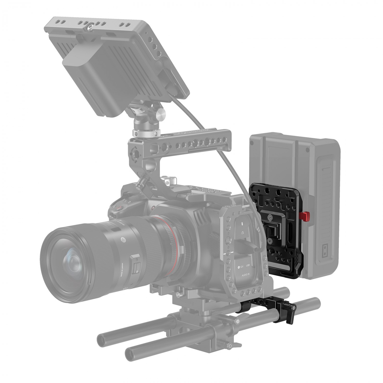 La placa SmallRig V Mount Battery Plate con brazo ajustable 2991, con montura V estándar, es compatible con la mayoría de las baterías V Mount y proporciona una mayor autonomía a tu equipo de cámara gracias a los puertos de alimentación de la batería. Se suministra con una abrazadera doble para barra de 15 mm con brazo ajustable, que ayuda a fijar la placa a su sistema de barras LWS de 15 mm y a ajustar la posición de la batería V-mount según sea necesario. La placa cuenta con varios orificios roscados de 1/4-20", M3 y M4, así como un orificio roscado ARRI de 3/8"-16 para conectar la abrazadera de doble varilla, un brazo mágico u otros accesorios. Dos topes evitan que la batería se tuerza al conectarla. La placa también es compatible con la cámara Blackmagic URSA mini.